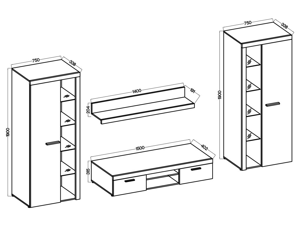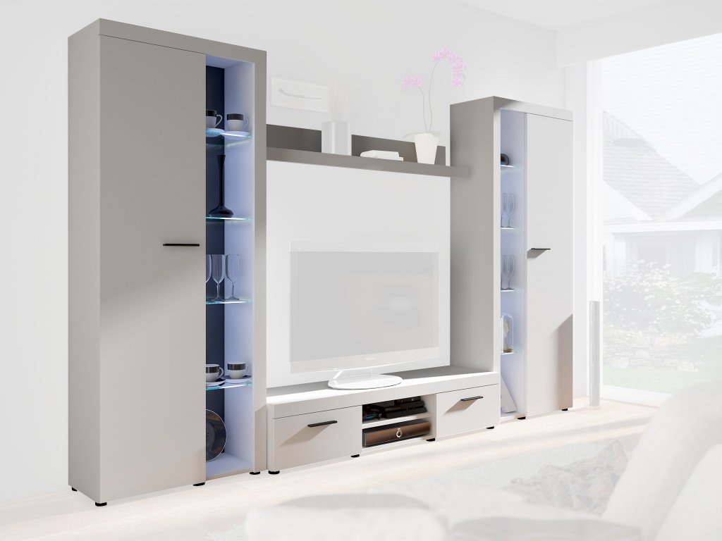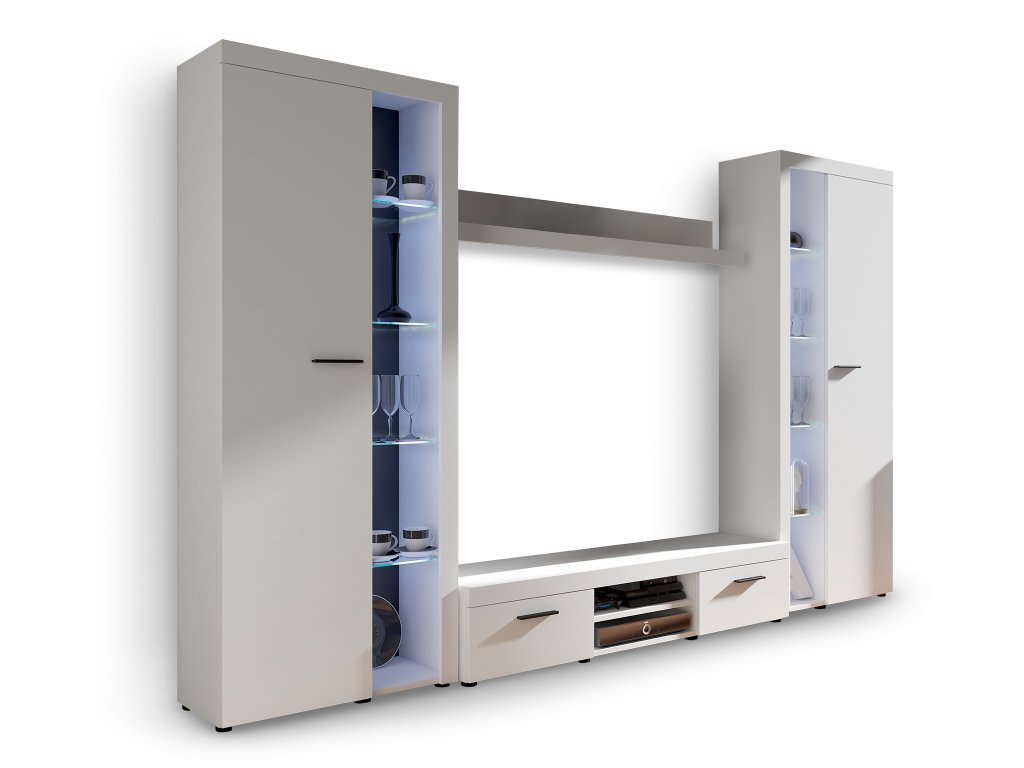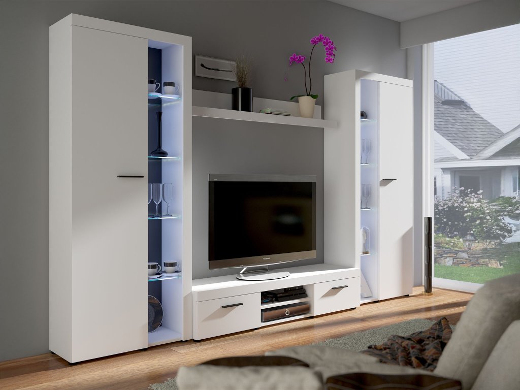 Moderná obývacia stena Rumba v elegantnom bielom prevedení zoskupuje všetky potrebné nábytky do vašej obývačky. Táto zostava obsahuje vysokú vitrínu, menšiu vitrínu, praktický TV stolík a nástennú policu, vďaka čomu ponúka dostatok úložného aj výstavného priestoru.Obývacia stena je vyrobená z kvalitnej laminovanej drevotriesky, ktorá zabezpečuje vysokú odolnosť a dlhú životnosť nábytku. Nadčasový dizajn a neutrálne farebné prevedenie umožňujú ľahké zakomponovanie do rôznych typov interiérov. Nábytok je vybavený niekoľkými policami. Má aj sklenené police, ktorédodávajú celej zostave elegantný nádych a umožňujú štýlové vystavenie dekorácií či iných predmetov. Jej vnútorný priestor je ladený do bielej farby.