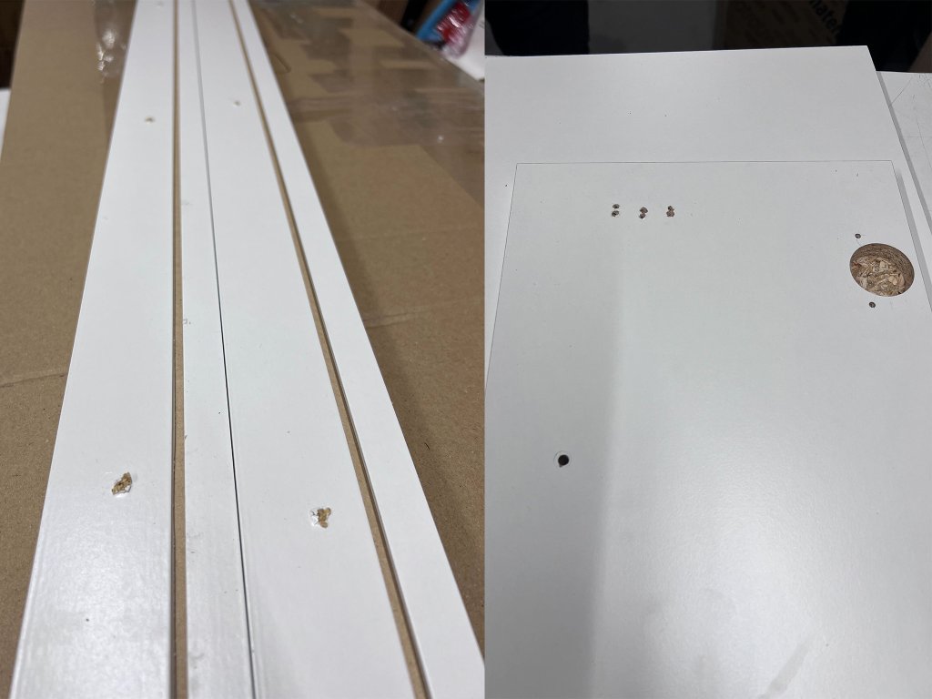 Obývacia stena bola zmontovaná a má drobné známky používania: poškodenie sa nachádza na vnútorných záslepkách veľkej skrine a na jedných dvierkach pri kovaní. Pri správnej montáži tieto nedostatky nie sú viditeľné. Detailné zábery drobných nedostatkov nájdete na priložených fotografiách. Tovar je dodávaný v originálnom balení.