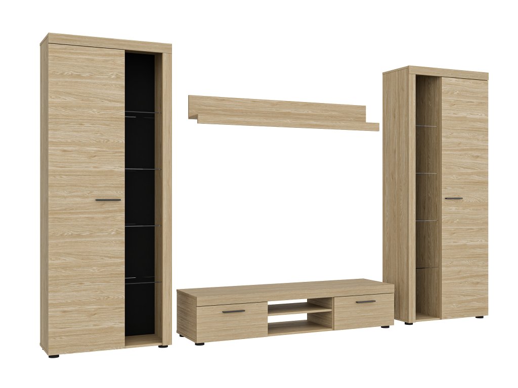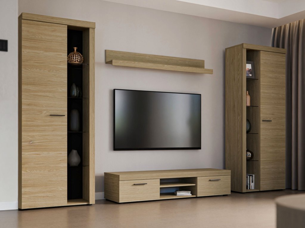 Tento set nábytku je navrhnutý s dôrazom na vyváženosť medzi skrytým úložným priestorom a otvorenými presklenými zónami. Vitríny so sklenenými policami dodávajú zostave moderný šmrnc a umožňujú vám kreatívne vystaviť porcelán, suveníry či zbierku kníh tak, aby boli chránené pred prachom, no stále na očiach. Vnútorné usporiadanie nábytku efektívne rozčleňuje priestor, zatiaľ čo dlhá horná doska TV stolíka hravo unesie aj modernú elektroniku s veľkou uhlopriečkou. Obývacia stena Rumba v dubovom prevedení je synonymom pre funkčnú estetiku, ktorá premení každý večer strávený v obývačke na výnimočný zážitok.