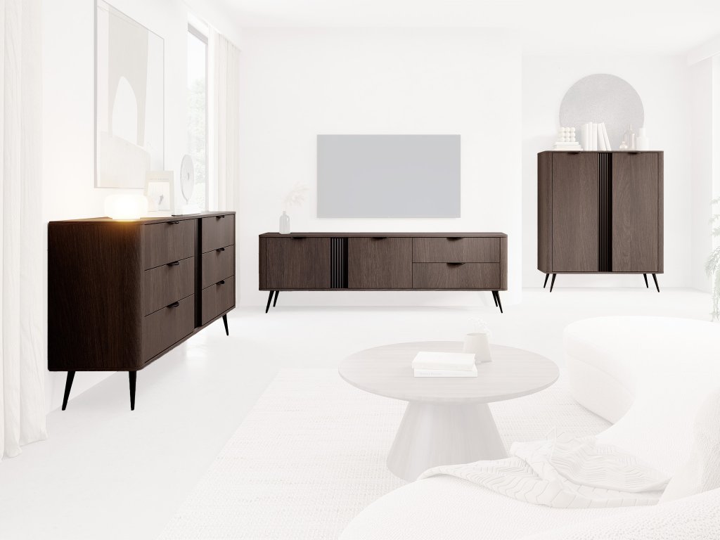 Kolekcia Veris prináša štýlový a moderný nábytok do vašej obývačky. Obsahuje niekoľko praktických a elegantných kusov – TV stolíky, komody rôznych veľkostí, vitrínu a dokonca aj nočný stolík. Nábytok je vyrobený v dekore dub Dunin. Kovové rukoväte a čierne prvky dodávajú nábytku industriálny a zároveň elegantný charakter. Zaoblené tvary všetko jemne zjemňujú a zaisťujú bezpečné používanie. Kolekcia Veris poskytuje široké možnosti kombinovania. Stačí pridať napríklad sedaciu súpravu, konferenčný stolík a ďalšie doplnky, aby ste vytvorili úplnú a harmonickú obývaciu izbu.