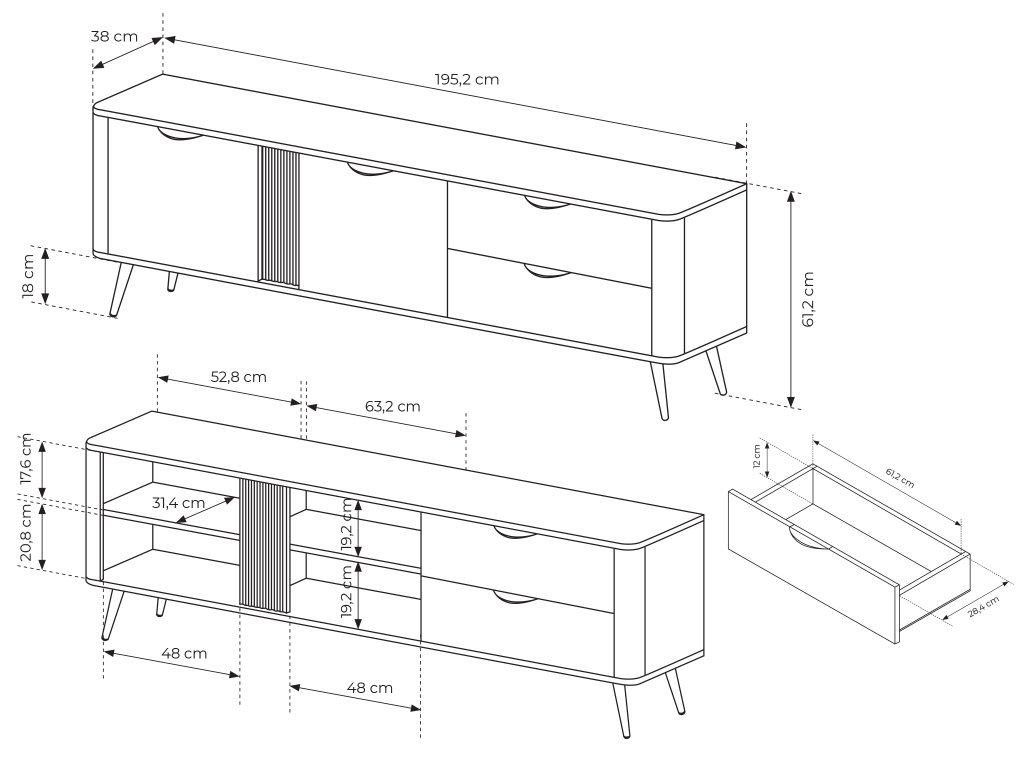 - TV stolík RTV 195 2D2S Veris: kombinuje moderný dizajn s praktickým úložným priestorom, ktorý zahŕňa dve zásuvky a dve dvierka so štyrmi policami. V dekoru dub dunin a s kvalitným spracovaním je ideálnym riešením pre štýlovú a prehľadnú obývačku. Rozmer: 195 x 61 x 38 cm