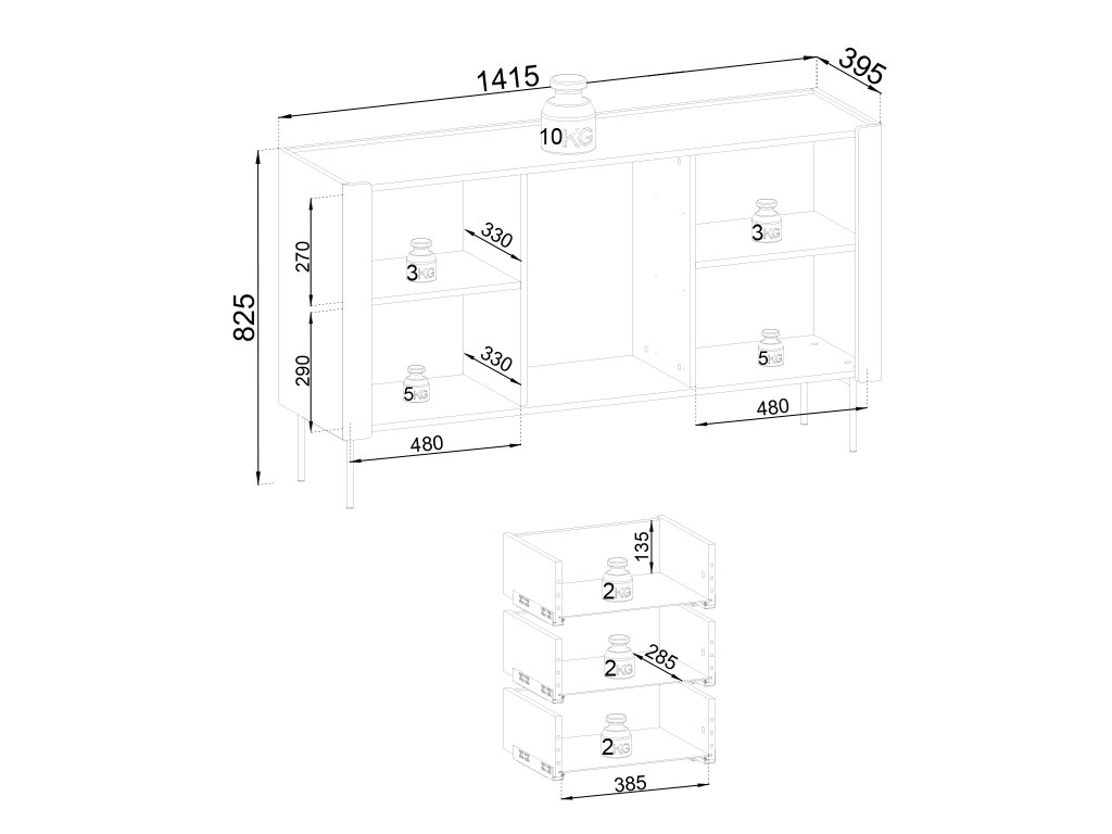 Komoda KSZ-141 je prakticky rozdelená na tri časti: po stranách sa nachádzajú dve skrinky s policami, ktoré poskytujú dostatok miesta na uloženie rôznych predmetov, a v strednej časti sú umiestnené tri priestranné šuflíky na drobnosti a každodenné veci.Rozmer (šxvxh): 141,5 x 82,5 x 39,5 cm