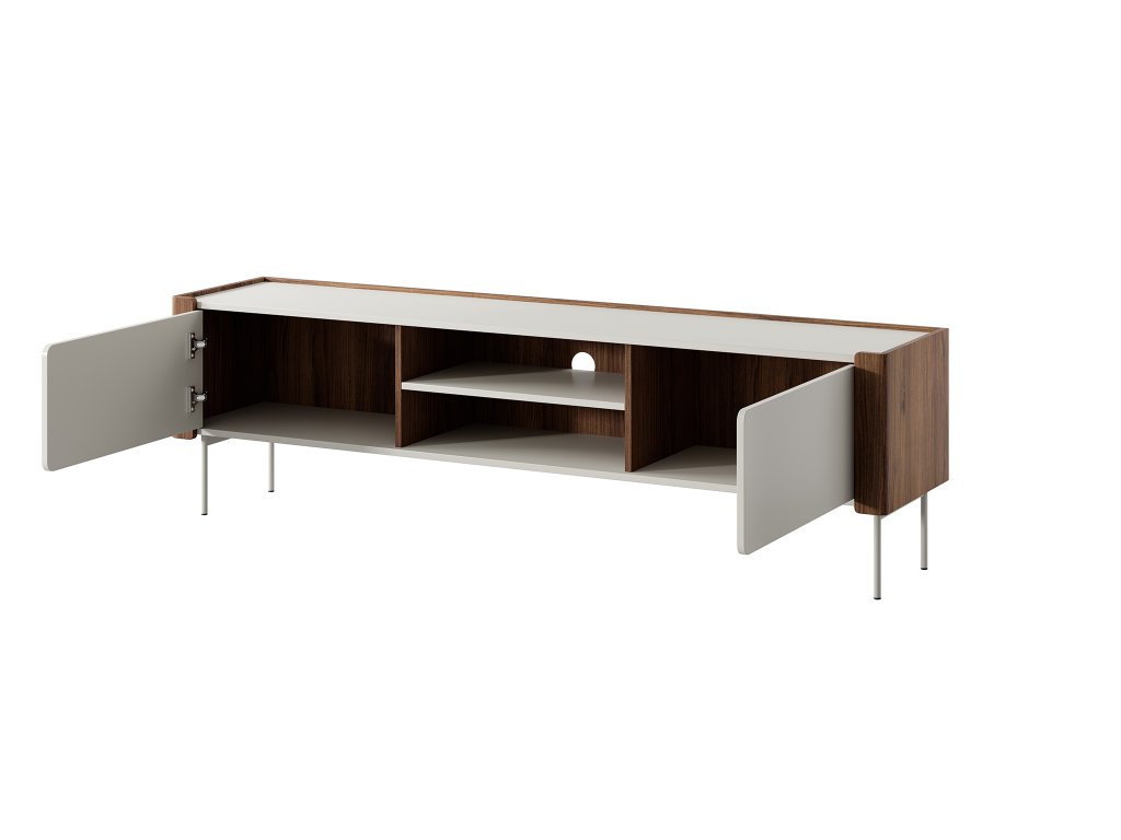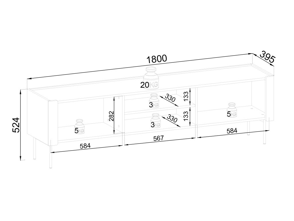 TV stolík RTV-180 má po stranách dvierka, za ktorými sa nachádza úložný priestor na drobnosti či príslušenstvo, a v strednej časti otvorený priestor s jednou poličkou, ktorý je ideálny na uloženie elektroniky a multimediálnych zariadení.Rozmer (šxvxh): 180 x 52,4 x 39,5 cm