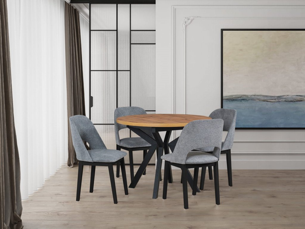 Okrúhly jedálenský stôl Ikon 7 je ideálnou voľbou do menších kuchýň či jedální, kde oceníte jeho kompaktné rozmery a praktickosť. Jeho laminovaná doska v dubovom dekore zaujme prírodným vzhľadom a zároveň sa vyznačuje vysokou odolnosťou voči poškrabaniu. Stabilitu stola zabezpečujú pevné kovové nohy v čiernej farbe, ktoré mu dodávajú moderný a elegantný charakter. Tento jedálenský stôl nielenže šetrí priestor, ale aj dodáva interiéru štýl, vďaka čomu sa stane praktickým a estetickým doplnkom vašej domácnosti.