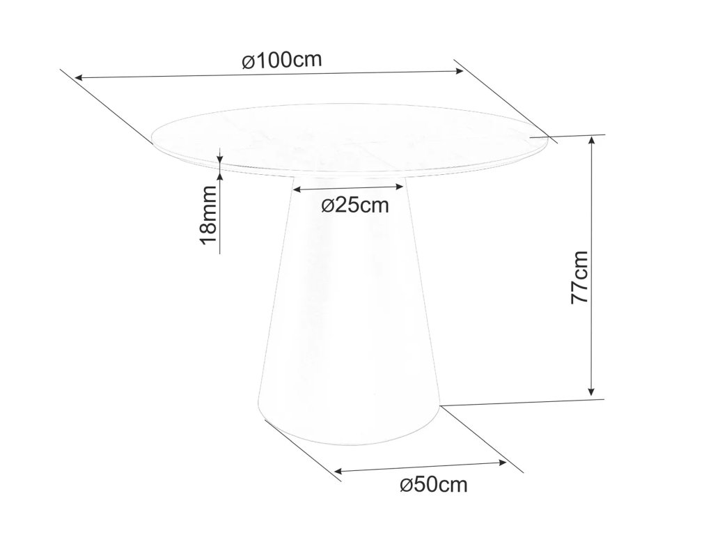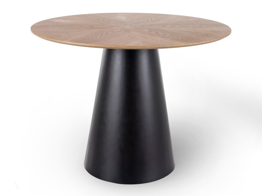 Vrchná doska je vyrobená z kvalitnej MDF dosky a pokrytá prírodnou dubovou dyhou, ktorá zvýrazňuje kresbu dreva a pôsobí autenticky. Podnož stola má výrazný kužeľovitý tvar a je vyrobená z lakovanej MDF v matnej čiernej farbe – dodáva stolu stabilitu aj moderný architektonický vzhľad. Tento dizajnový stôl je vhodný nielen do jedálne, ale aj do kuchyne či spoločenského priestoru, kde sa stane stredobodom miestnosti.