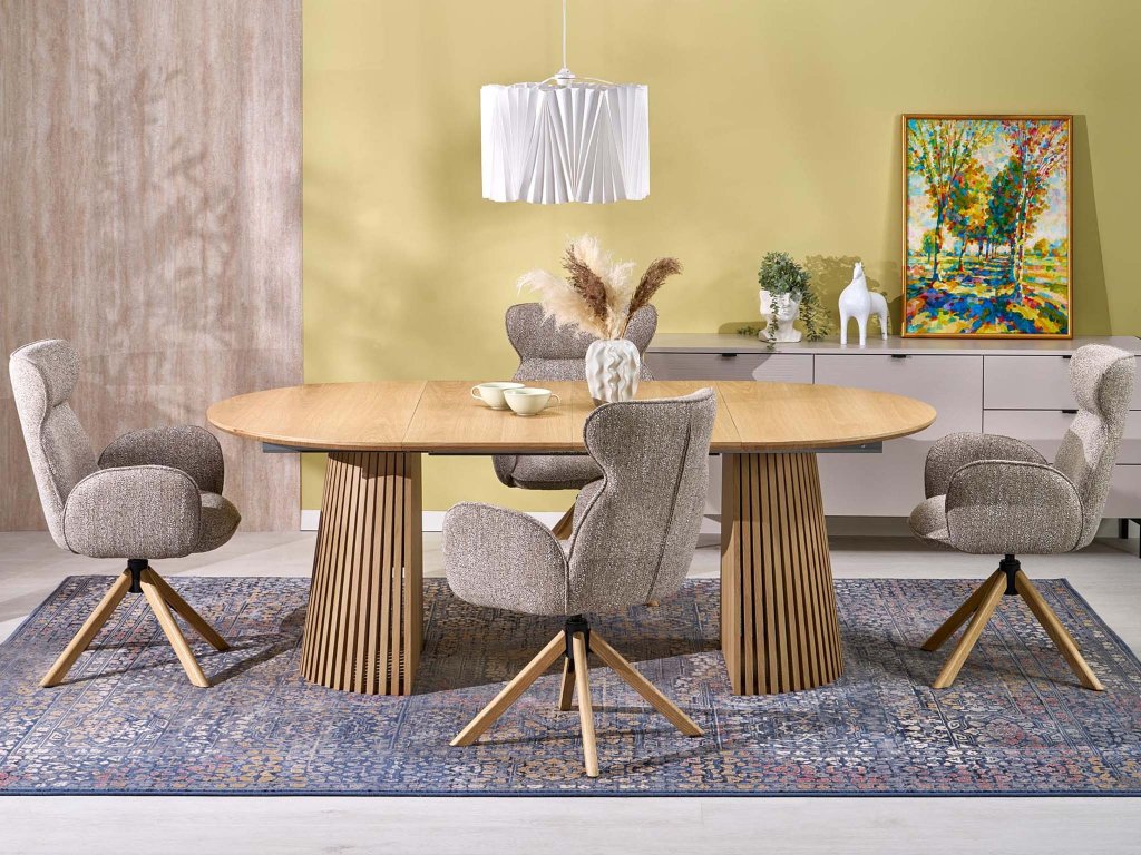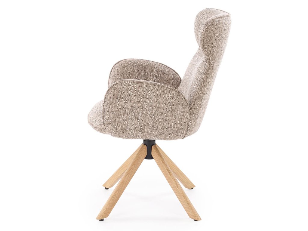 Kreslo Carla 585 stojí na stabilnej konštrukcii a šikmých nohách z masívneho dubového dreva, ktoré mu dodávajú prírodný vzhľad a pevnosť. Vizuálne ladí s moderným, škandinávskym aj prírodne ladeným interiérom.