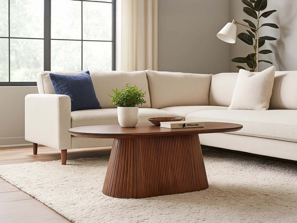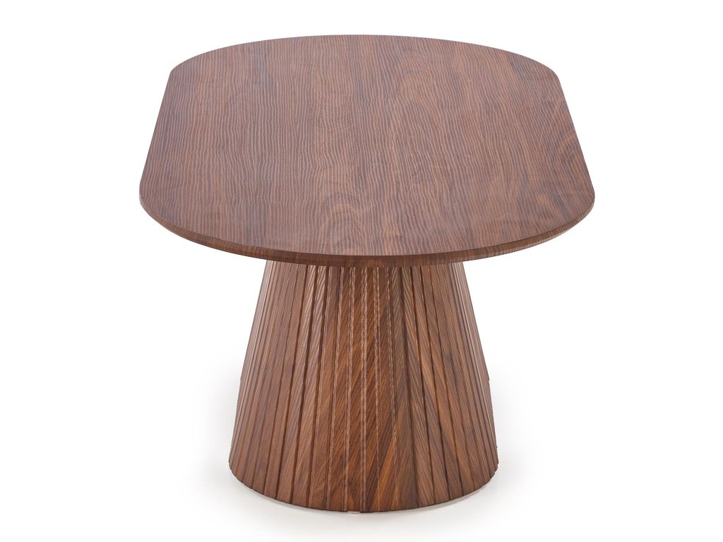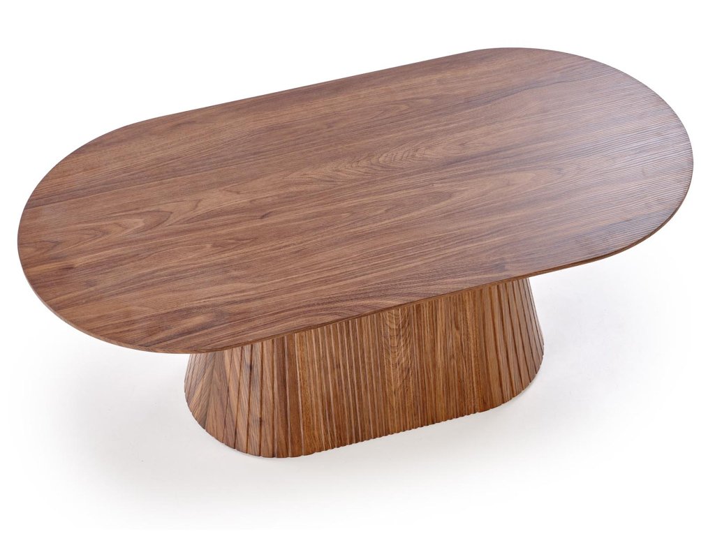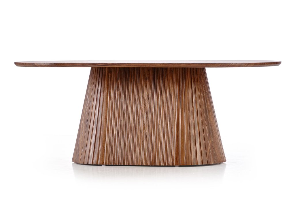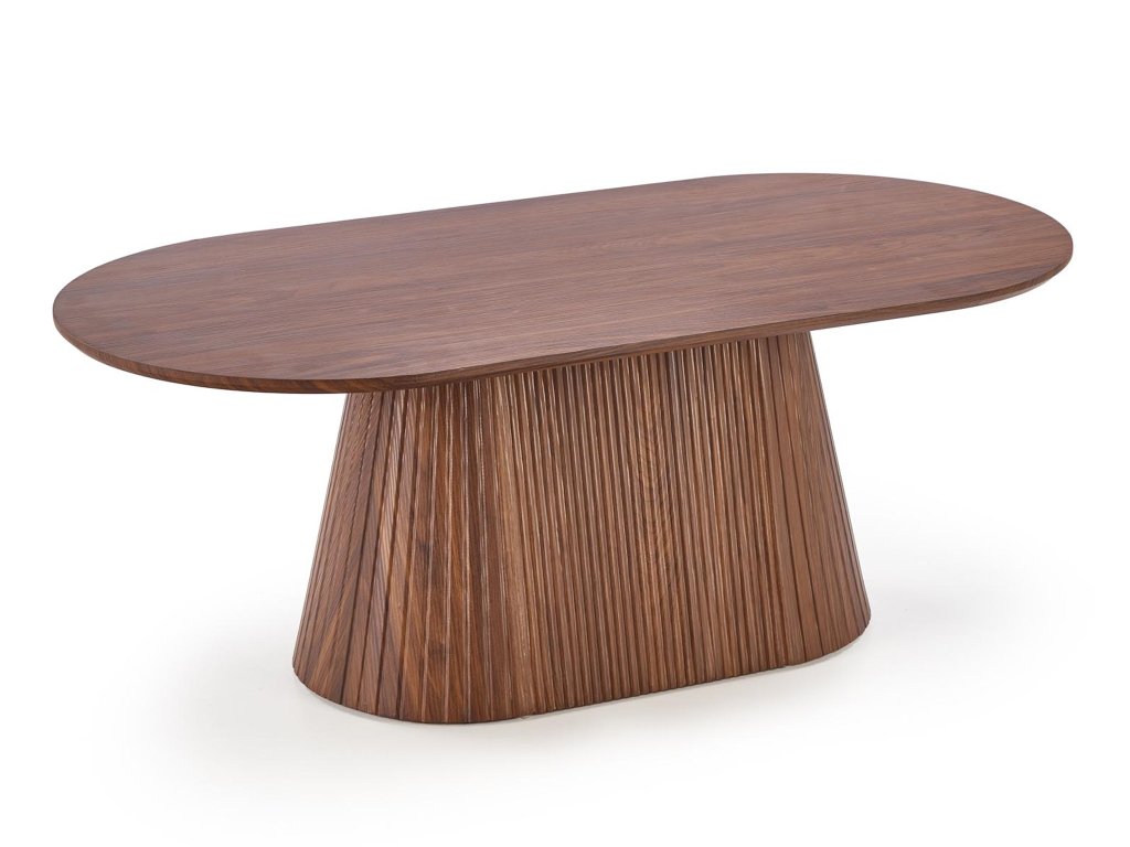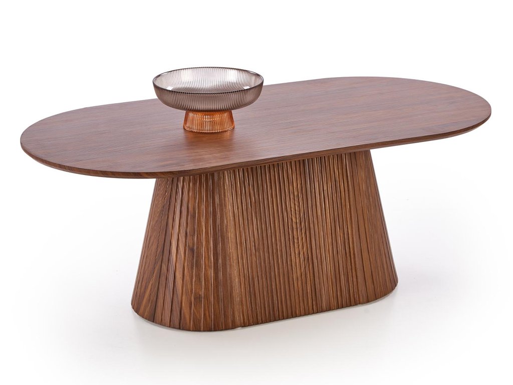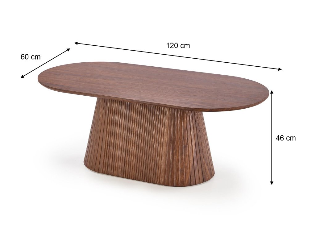 Stabilnú a zároveň esteticky výraznú základňu tvorí široká centrálna noha s originálnym vertikálnym ryhovaním, ktoré dodáva celkovému dizajnu stolíka hĺbku a vizuálny záujem. Základňa je taktiež vyrobená z MDF dosky vo farbe orecha, vďaka čomu stolík pôsobí celistvo a harmonicky.