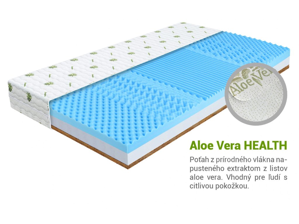 Prešívaný Aloe poťah má antialergické vlastnosti. Chráni matrac pred vývojom roztočov a tiež pred nečistotami. Špeciálne vlákna sú nasiaknuté z výťažkov listov aloe vera, vďaka tomu je poťah šetrný k pokožke. Poťah je možné prať v práčke na 30 °C.
