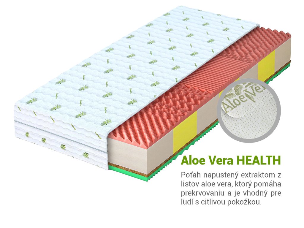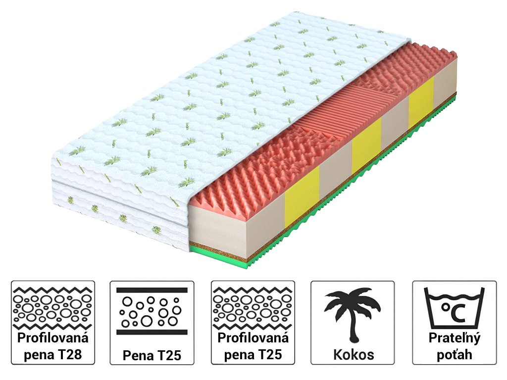 Materiálové zloženie: profilovaná polyuretánová pena T28, polyuretánová pena T25, kokosová vrstva, profilovaná polyuretánová pena T25, prešívaný poťah Aloe Vera