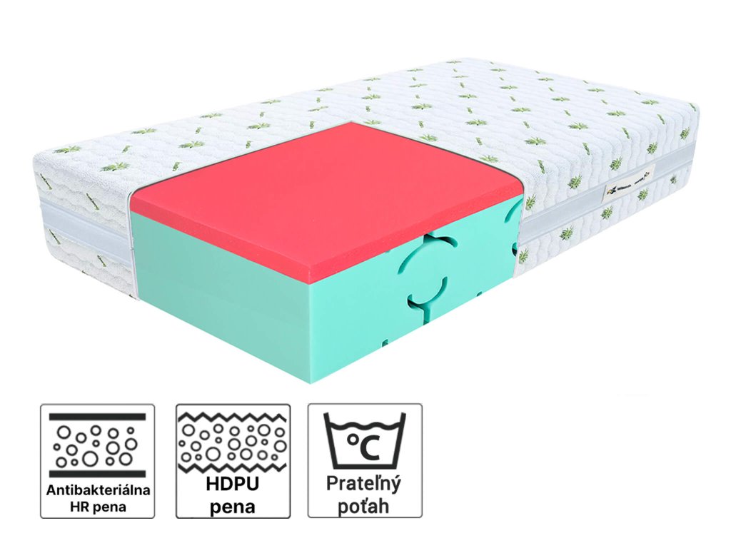 Antibakteriálna HR pena zabezpečuje dlhodobú čerstvosť a hygienu vášho spánku vďaka svojim vynikajúcim antibakteriálnym vlastnostiam. HDPU pena prispieva k výnimočnej podpore a stabilite počas spánku, zaisťujúc, že vaše telo je správne podopreté a relaxované počas celej noci. Obojstranné použitie matraca Luna ponúka možnosť vybrať si stupeň tvrdosti podľa vašej aktuálnej potreby - z jednej strany stredne tvrdý pre tých, ktorí uprednostňujú miernejšiu podporu, a z druhej strany tvrdý pre tých, ktorí potrebujú pevnejšiu podložku pre svoj spánok. Kvalitný odnímateľný poťah matraca je s aloe Vera, ktorá pridáva ďalšiu vrstvu ochrany pred mikróbmi a baktériami, zároveň udržiava poťah dlhodobo svieži a bez zápachu. Poťah je možné jednoducho odňať a vyprať v práčke pri teplote do 30 stupňov, čím sa uľahčuje udržiavanie čistoty a hygieny matraca. 3D páska na poťahu matraca je inovatívna technológia, ktorá zabezpečuje efektívne odvetranie a optimálnu cirkuláciu vzduchu. Táto špeciálna vrstva materiálu pomáha udržať matrac čistý a suchý, čo prispieva k lepšiemu spánku.