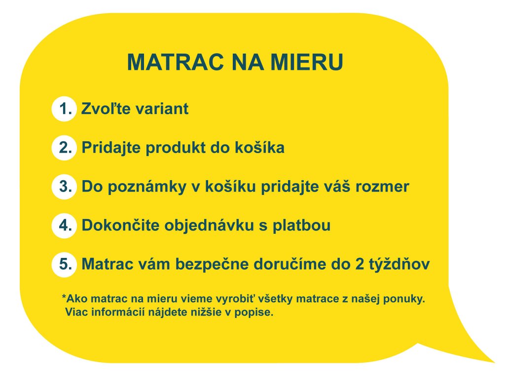 Pri tovare na zákazku (tzv. tovar na objednávku - matrace vyhotovené na mieru) je potrebné uhradiť vopred celú platbu za tovar. Takúto objednávku môžete stornovať najneskôr do 48 hodín. Tovar vyrobený na zákazku nie je možné vrátiť. Doba dodania pri tovare na zákazku sa môže líšiť od doby dodania uvedenej na stránke.