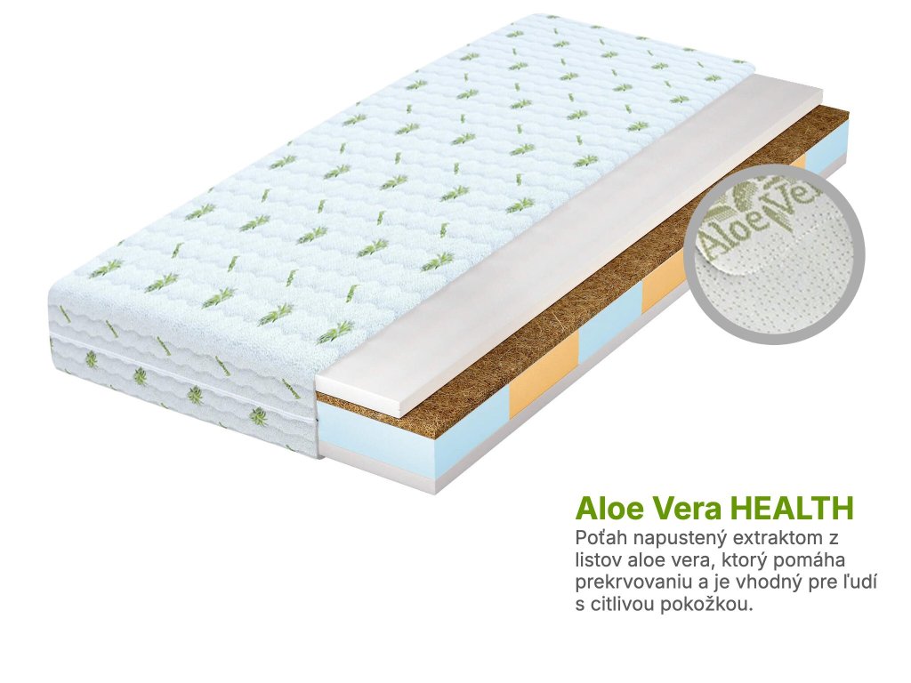 Matrac má antialergický poťah na zips Aloe Vera HEALTH, ktorý je prateľný v práčke na 30 °C. Poťah je z prírodného vlákna napusteného extraktom z listov aloe vera. Je vhodný pre ľudí s citlivou pokožkou