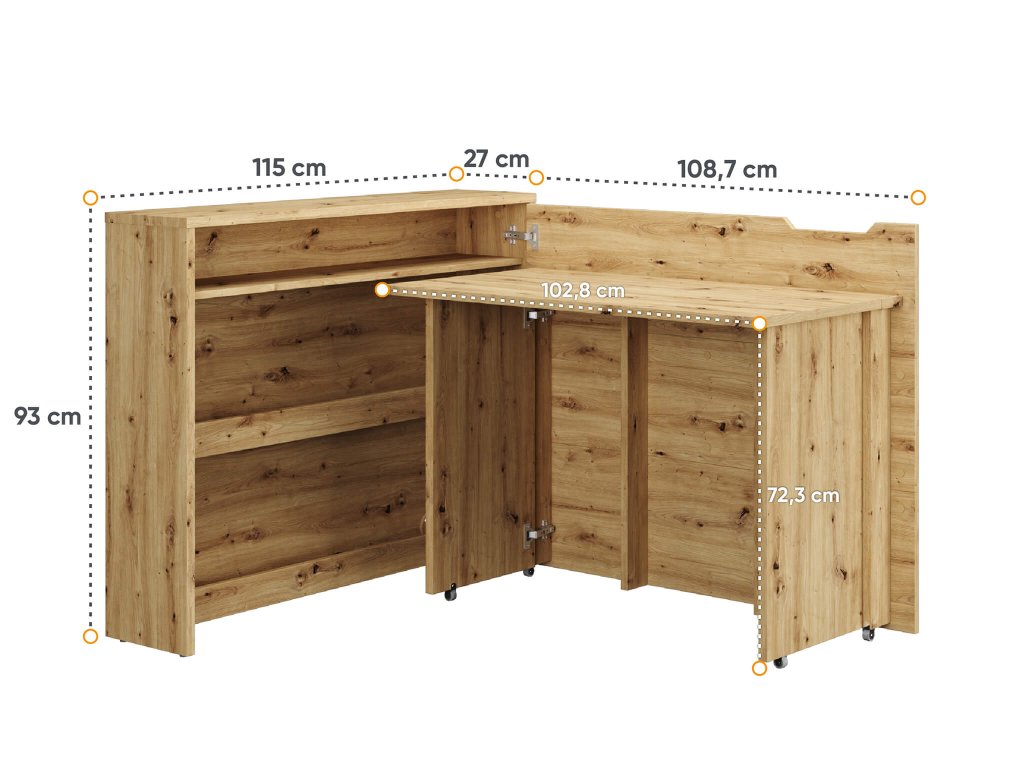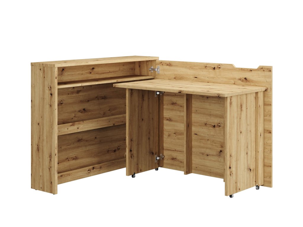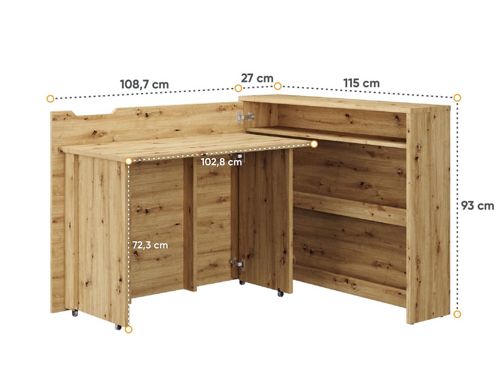 Rozkladací písací stôl máme v troch farebných prevedeniach. Vyberte si stolík, ktorý sa rozkladá na pravú/ľavú stranu podľa rozloženia nábytku v byte. Na strane, s ktorou nehýbete sa nachádzajú tri poličky. Pracovný stôl je vyrobený z kvalitnej laminovanej dosky s odolnými ABS hranami. Rozkladacia časť je celá na kolieskach, takže sa s ňou jednoducho a ľahko manipuluje.