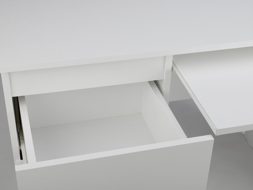 V každej študentskej izbe alebo pracovni je potrebné mať kvalitný písací stôl. Leo L1 biely písací stôl dokonale zapadne do každého interiéru. Univerzálny biely stôl je doplnený elegantnými čiernymi úchytkami. Poskytuje dostatok priestoru na prácu a organizáciu. Písací stôl Leo L1 má pevnú konštrukciu vďaka čomu je pripravený zvládnuť aj tie najnáročnejšie pracovné dni. Biela drevotriesková doska KRONO spolu s čiernymi úchytmi spája eleganciu s odolnosť. Pracovný stôl má tiež bielu PVC pásku HRANIPEX, čo mu dodáva dokonalý finálny vzhľad. Poriadok vám pomôžu udržať tri zásuvky a jedna výsuvná písacia doska. Výsuvná doska môže poslúžiť ako úložný priestor ale aj na vysúvanie klávesnice. Písací stôl Leo L1 je praktický stolík vhodný na študovanie ale aj na vytvorenie pracovného kútiku.