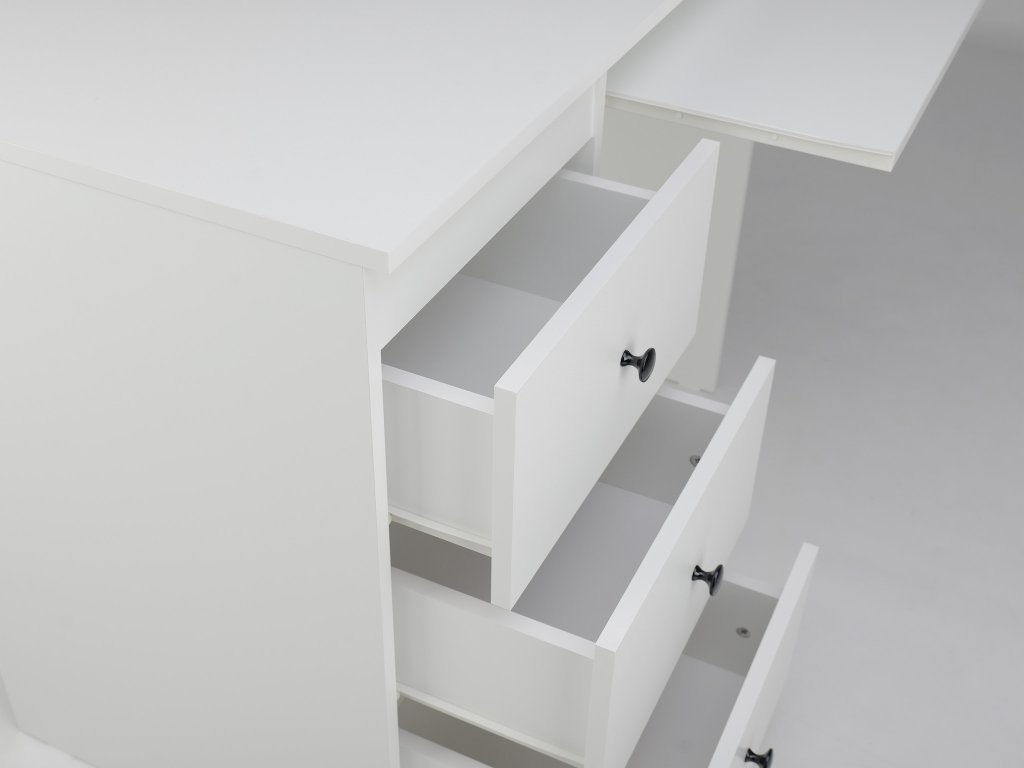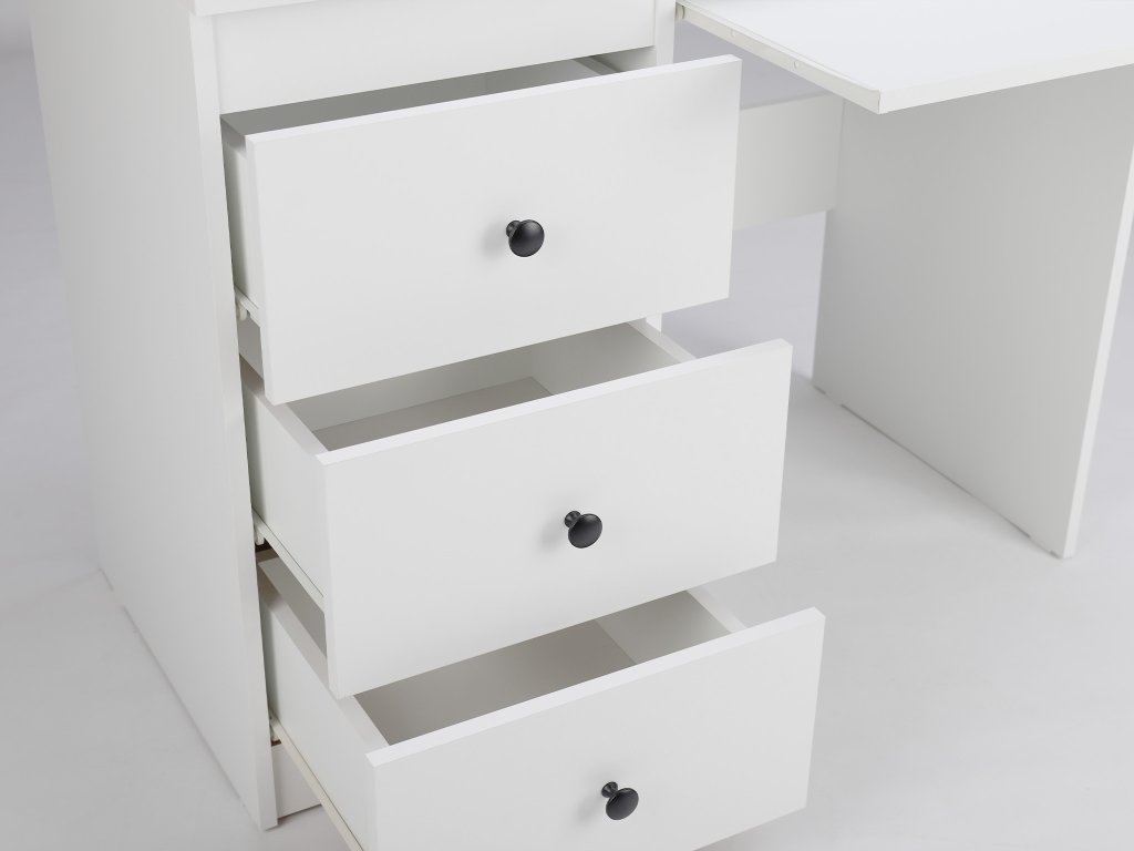 Doplňte vašu študentskú izbu s bielym písacím stolom Leo L1, ktorý prinesie eleganciu a funkčnosť do vášho domova či kancelárie. Potrebuje spoľahlivý a štýlový doplnok pre váš pracovný priestor? Univerzálny biely stôl je pre vás ideálnou voľbou. Jeho čistý, moderný dizajn s čiernymi úchytkami sa skvele hodí do každého interiéru, pričom poskytuje dostatok priestoru na prácu a organizáciu. Dodajte vášmu priestoru štýl s praktickým písacím stolíkom, ktorý je s pevnou konštrukciou a vysokokvalitnými materiálmi pripravený zvládnuť aj tie najnáročnejšie pracovné dni. Biela drevotriesková doska KRONO spolu s čiernymi úchytmi spája eleganciu s odolnosť. Pracovný stôl je vybavený bielou PVC páskou HRANIPEX, čo mu dodáva dokonalý finálny vzhľad. Vďaka trom zásuvkami a jednou výsuvnou písacou doskou získavate dostatok úložného priestoru na usporiadanie vašich pracovných potrieb. Výsuvná doska tiež poslúži na uloženie klávesnice či kníh. Písací stôl Leo L1 vám umožňuje sústrediť sa na to, čo je pre vás dôležité, a prináša vám pokojné a produktívne pracovné prostredie.