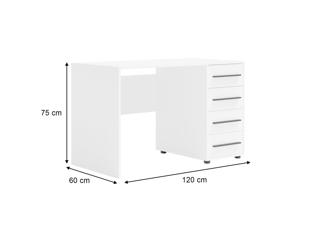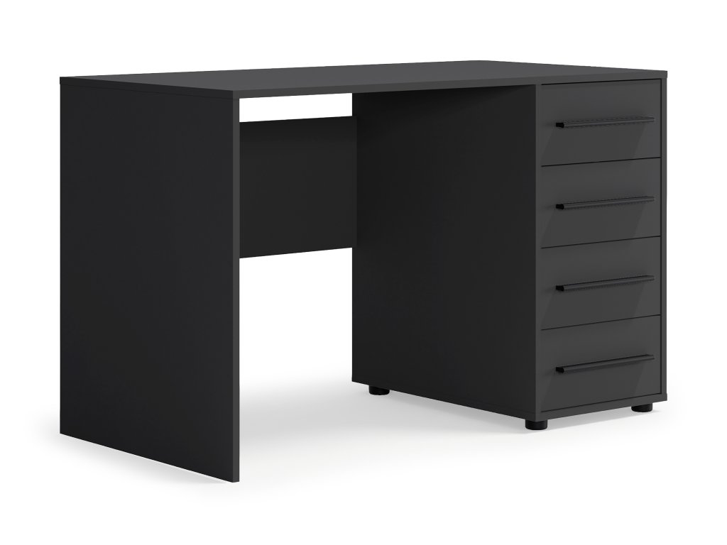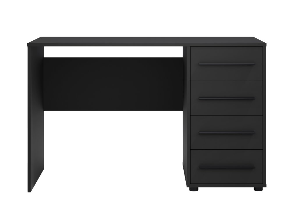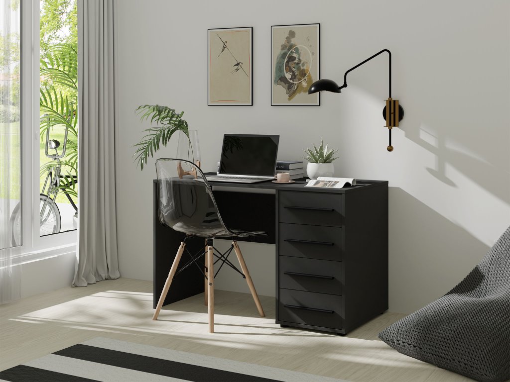 Písací stolík Maxione v štýlovom čiernom prevedení prináša do interiéru moderný a elegantný vzhľad. Vďaka svojmu modernému dizajnu je vhodný do pracovne, študentskej aj detskej izby a ľahko zapadne k ostatnému zariadeniu. Štyri priestranné zásuvky s čiernymi úchytmi ponúkajú dostatok úložného priestoru na dokumenty, zošity či kancelárske potreby, vďaka čomu bude váš pracovný priestor vždy prehľadný a organizovaný.
