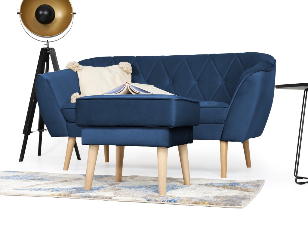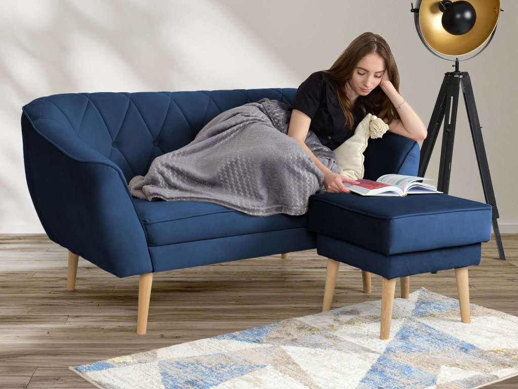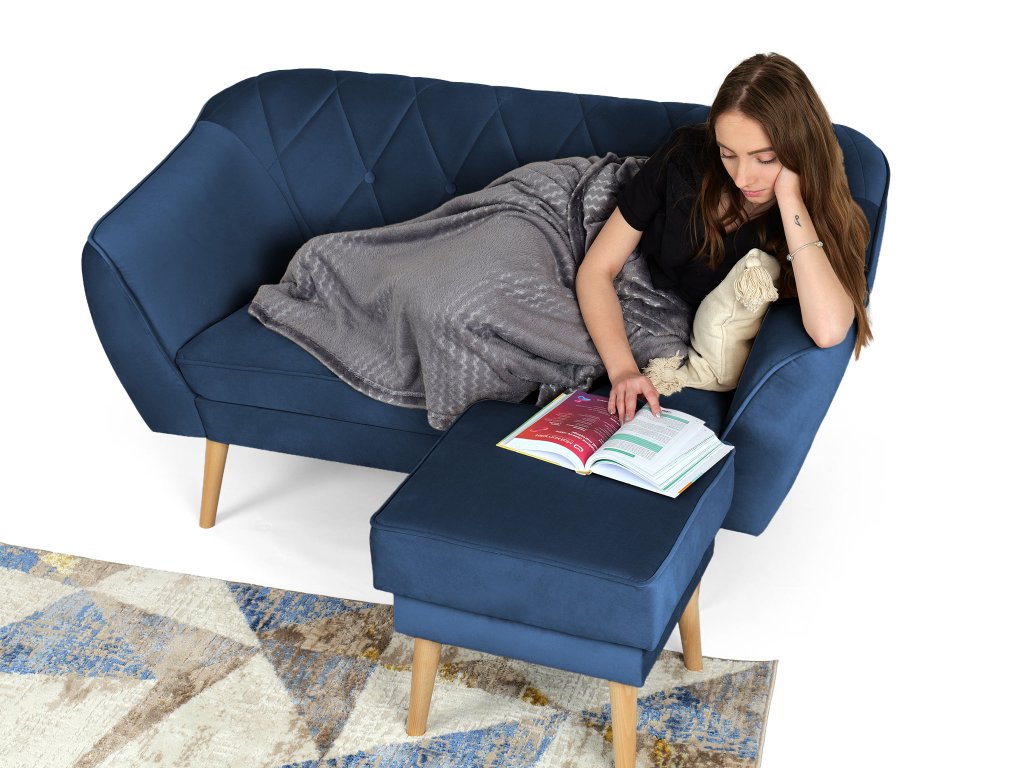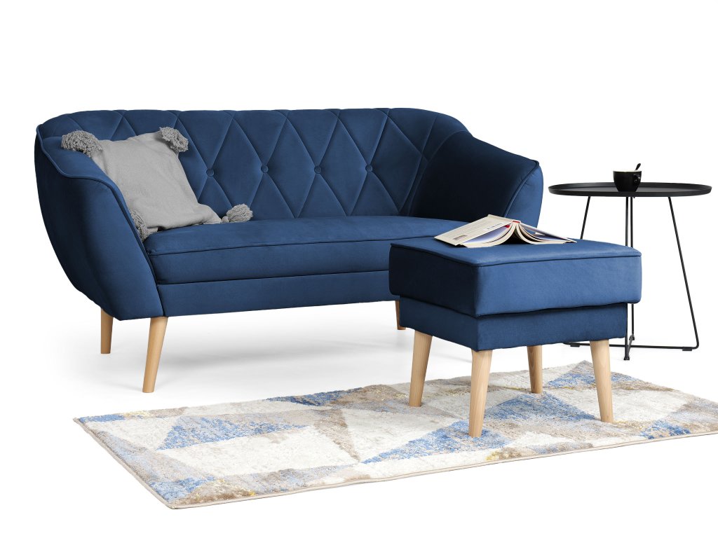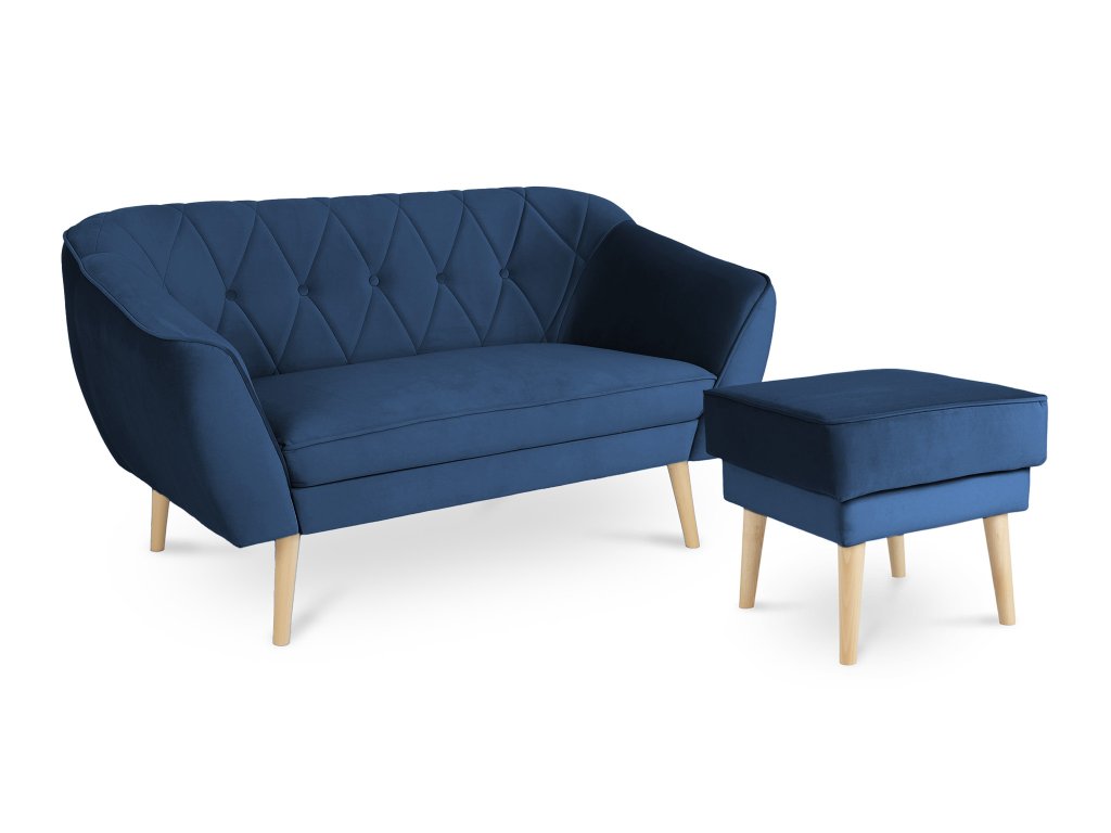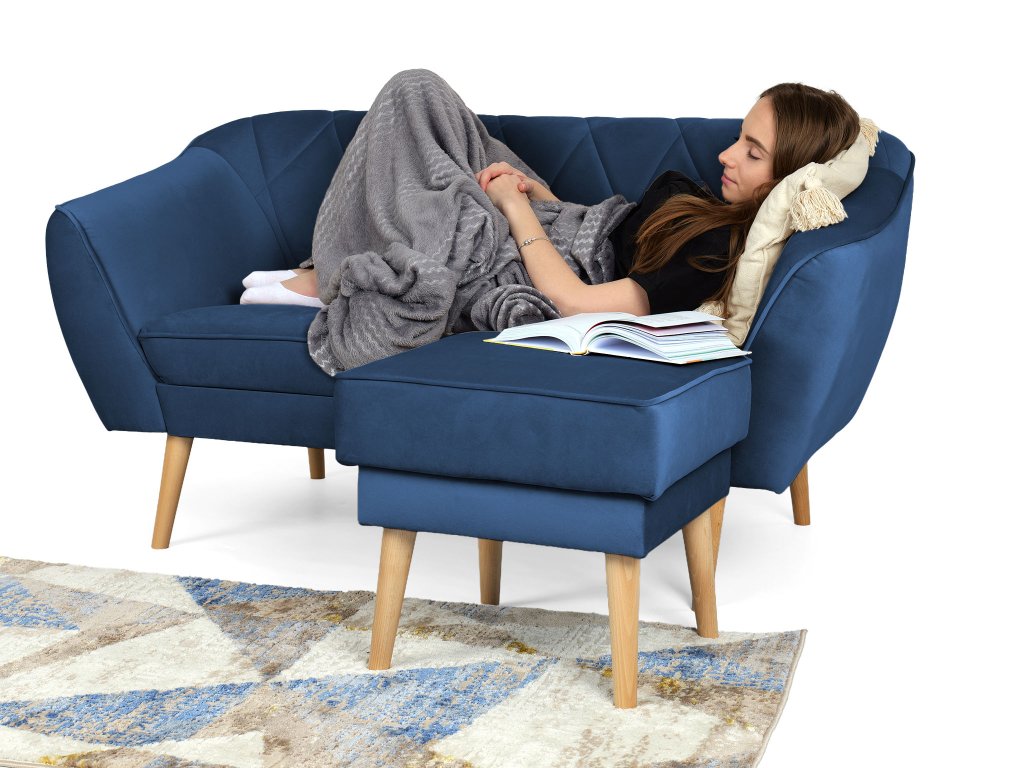 Elegantná sada pohovky Deana II a taburetu v sýto modrej farbe ponúka nielen pohodlie, ale aj moderný vzhľad, ktorý zútulní každý interiér. Pohovka je určená pre dve osoby a vďaka svojim kompaktným rozmerom sa výborne hodí aj do menších miestností, ako sú kancelárie, hosťovské priestory či útulné obývačky. Sedacia časť je vyplnená kvalitnou penou T30, ktorá zaisťuje príjemné sedenie. Operadlo dopĺňa jemné prešívanie a výplň z peny T25, ktorá poskytuje pevnú, ale komfortnú oporu chrbta.