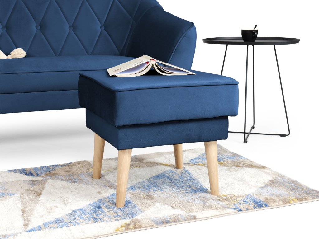 Taburet, ktorý je súčasťou sady, môžete využiť ako oporu pod nohy, doplnkové sedenie alebo praktický kúsok do vstupnej haly. Vďaka svojej stabilite a nosnosti do 80 kg poslúži aj ako samostatný nábytok na každodenné používanie. Oba prvky kolekcie sú potiahnuté príjemnou látkou typu Velur Royal, ktorá pôsobí luxusne a je zároveň praktická na údržbu. Nežmolkuje sa a ostáva príjemná na dotyk aj pri dlhodobom používaní. Drevené nožičky z masívu dodávajú sade prirodzený nádych a ľahkosť.