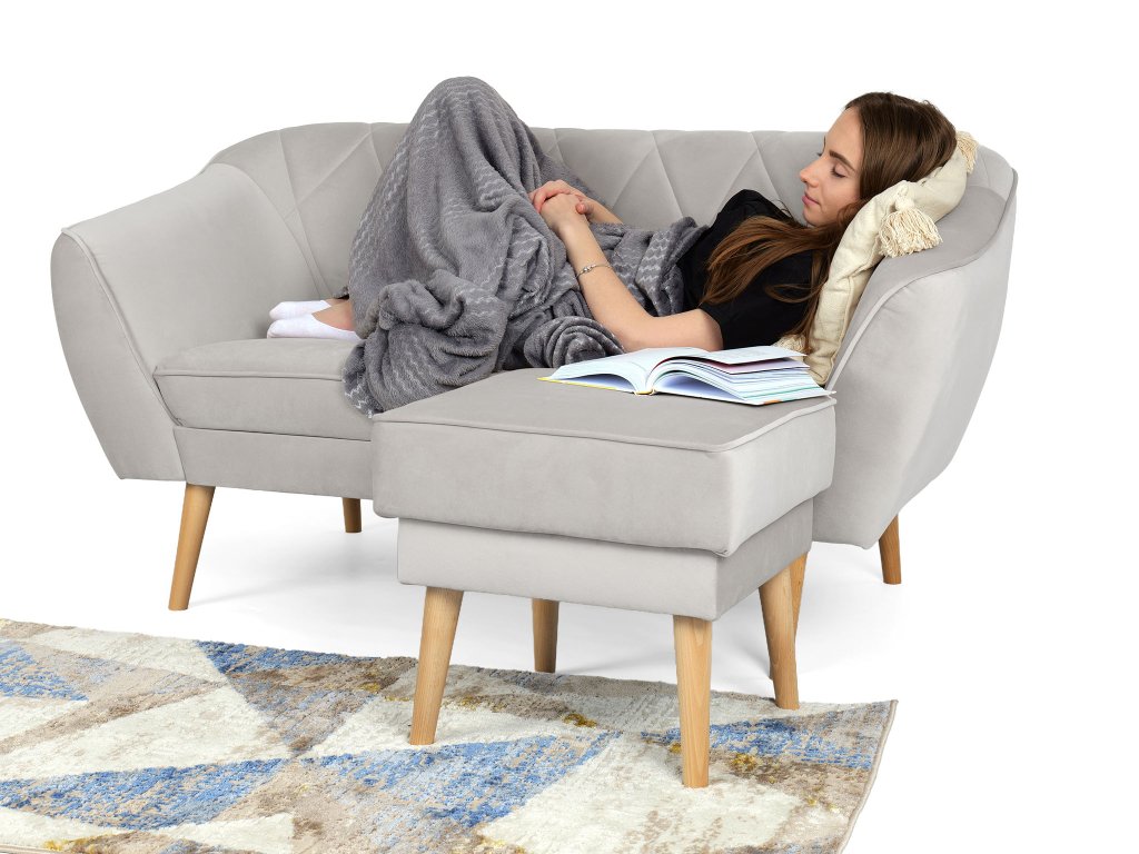 Oba kúsky sú potiahnuté látkou Velur Royal, ktorá je jemná, príjemná na dotyk a odolná voči žmolkovaniu. Ich celkový vzhľad dotvárajú nožičky z prírodného dreva, ktoré pôsobia vzdušne a dodávajú nábytku škandinávsky charakter. Sedadlo pohovky je vyplnené penou T30, ktorá poskytuje pevnú, ale pohodlnú oporu, zatiaľ čo operadlo s penou T25 a decentným prešívaním zaisťuje príjemný komfort pri sedení.