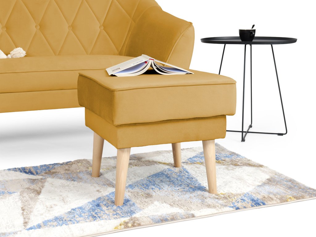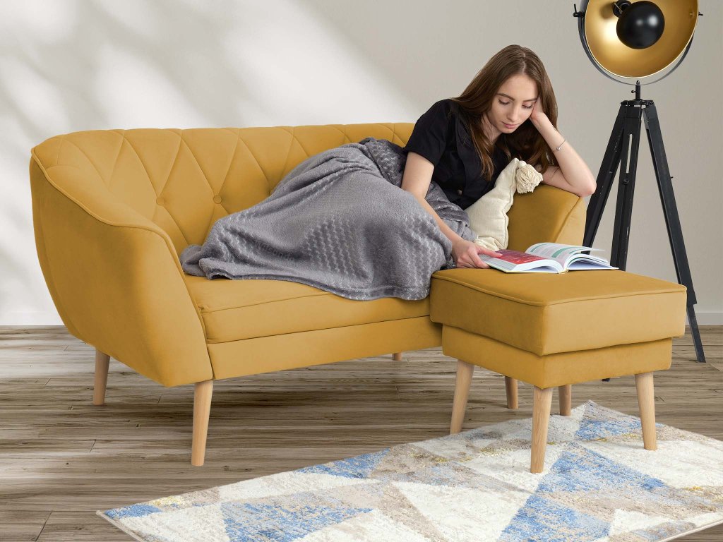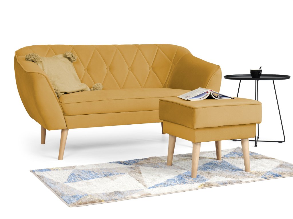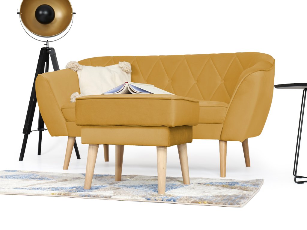 Sada dvojmiestnej pohovky Deana II s taburetom v žltom prevedení vnesie do interiéru dávku pozitívnej energie a tepla. Vďaka svojim kompaktným rozmerom je ideálnym riešením aj pre menšie priestory, no zároveň poskytuje dostatok miesta na pohodlné sedenie pre dvoch. Praktický taburet v rovnakom štýle dopĺňa celkový vzhľad a zároveň ponúka ďalší priestor na vyloženie nôh, príležitostné sedenie alebo ako odkladaciu plochu.