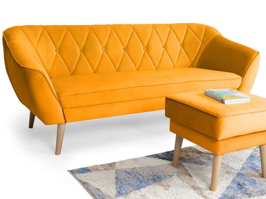 Trojmiestna pohovka Deana III s taburetom v oranžovej farbe je dokonalou kombináciou dizajnu, komfortu a praktickosti vo vašej obývačke alebo kancelárii. Nábytok je čalúnený kvalitnou látkou Magic Velvet, ktorá pôsobí elegantne a luxusne. Na dotyk je mimoriadne hebká, zároveň však vyniká vysokou odolnosťou voči opotrebovaniu a ľahkou údržbou. Látka si zachováva sýtosť farby aj pri intenzívnom používaní. O pohodlie sa stará kombinácia výplní. Operadlá sú vyplnené penou T25, ktorá poskytuje príjemnú oporu chrbtu, zatiaľ čo sedadlá využívajú hustejšiu penu T30 pre stabilné a pohodlné sedenie s dlhou životnosťou. Celkový vzhľad dotvárajú pevné drevené nožičky v neutrálnom prírodnom odtieni. Tie dodávajú nábytku nielen stabilitu, nadčasový charakter. Sedacia súprava Deana III je ideálnym riešením pre každého, kto túži po komforte zabalenom do moderného dizajnu.
