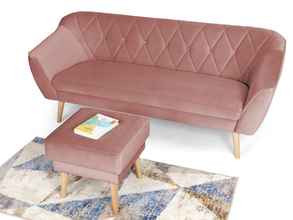 Ak hľadáte spojenie moderného dizajnu a pohodlia, trojmiestna pohovka Deana s praktickým taburetom vás osloví už na prvý pohľad. Jej ružové čalúnenie v látke Royal vnesie do vašej obývačky alebo inej miestnosti nádych luxusu. Táto látka je hebká, odolná voči opotrebovaniu a mimoriadne jednoduchá na údržbu. Sedadlá pohovky sú vystužené pevnou penou T30, ktorá poskytuje stabilitu a tvarovú stálosť, zatiaľ čo operadlá z mäkšej peny T25 sa postarajú o príjemnú oporu počas oddychu. Celú zostavu dopĺňajú drevené nožičky v prírodnom odtieni, ktoré pohovke dodávajú pevnú oporu.