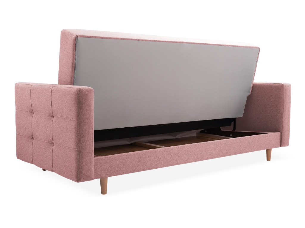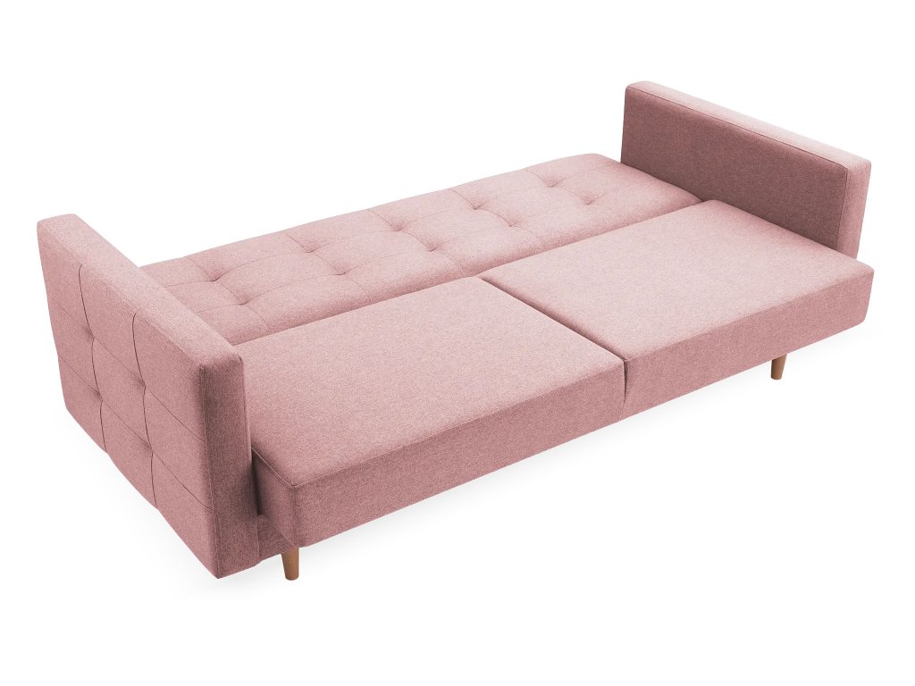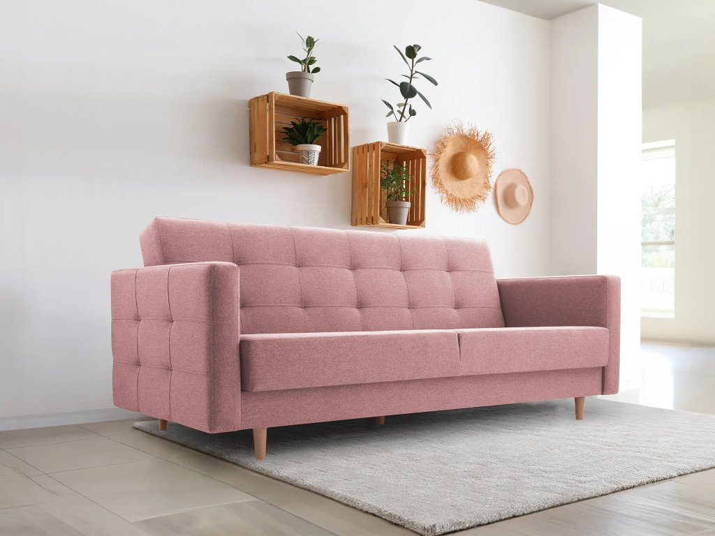 Ružová pohovka Godivo ponúka štýl aj funkčnosť. Pružiny BONELL a pena T30 zaručujú pohodlie, mechanizmus KLIK-KLAK uľahčuje rozkladanie. Ideálna na každodenné využitie. Drevené nohy dodávajú pohovke elegantný vzhľad a zároveň zabezpečujú pevné postavenie. Pohovka je čalúnená luxusnou zamatovou látkou Norn 52 v ružovej farbe – je jemná, odolná voči žmolkovaniu a príjemná na dotyk. Drevené nohy v minimalistickom štýle dodávajú pohovke moderný vzhľad a výbornú stabilitu. Pohovku odporúčame zladiť s kreslom z tej istej kolekcie.