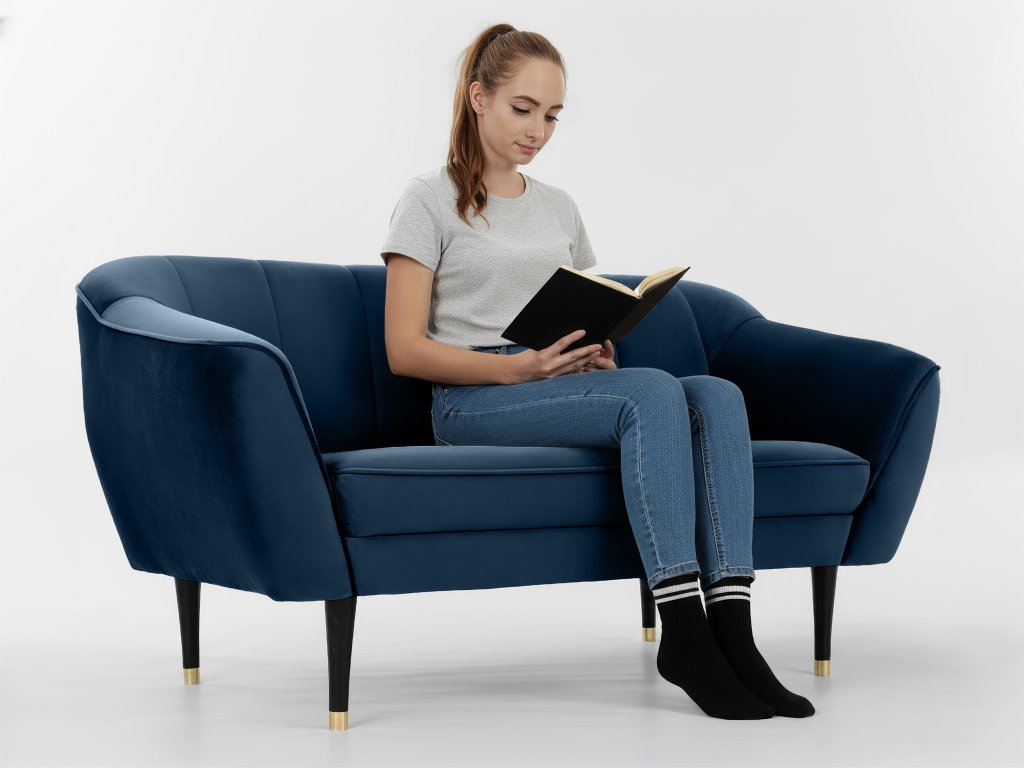 Pohovka II Diva v modrej farbe je dvojmiestny model, ktorý spája moderný dizajn s vysokým komfortom. Vďaka čalúneniu látkou Velur Royal pôsobí luxusne, no zároveň prakticky – je mäkká na dotyk, nežmolkuje sa a má vysokú odolnosť voči oderu. Vertikálne prešívanie operadla, čierne nožičky so zlatým detailom a kvalitná pena v sedacej časti vytvárajú harmonický celok, ktorý sa hodí do obývačky, kancelárie či štýlovej predsiene.