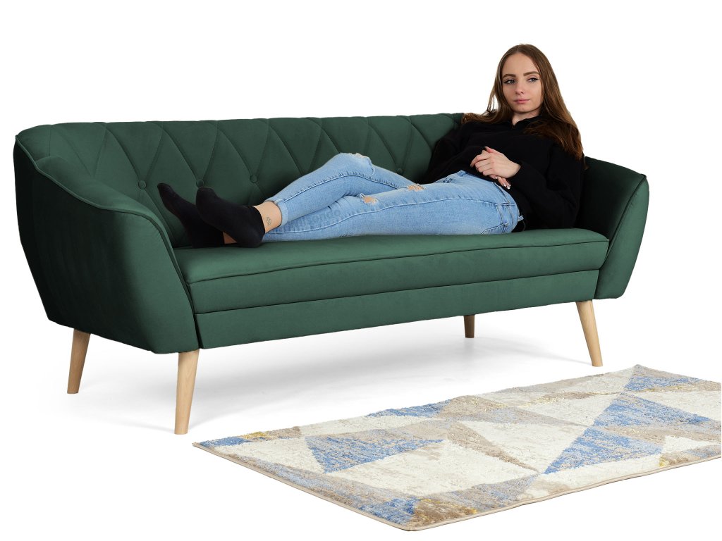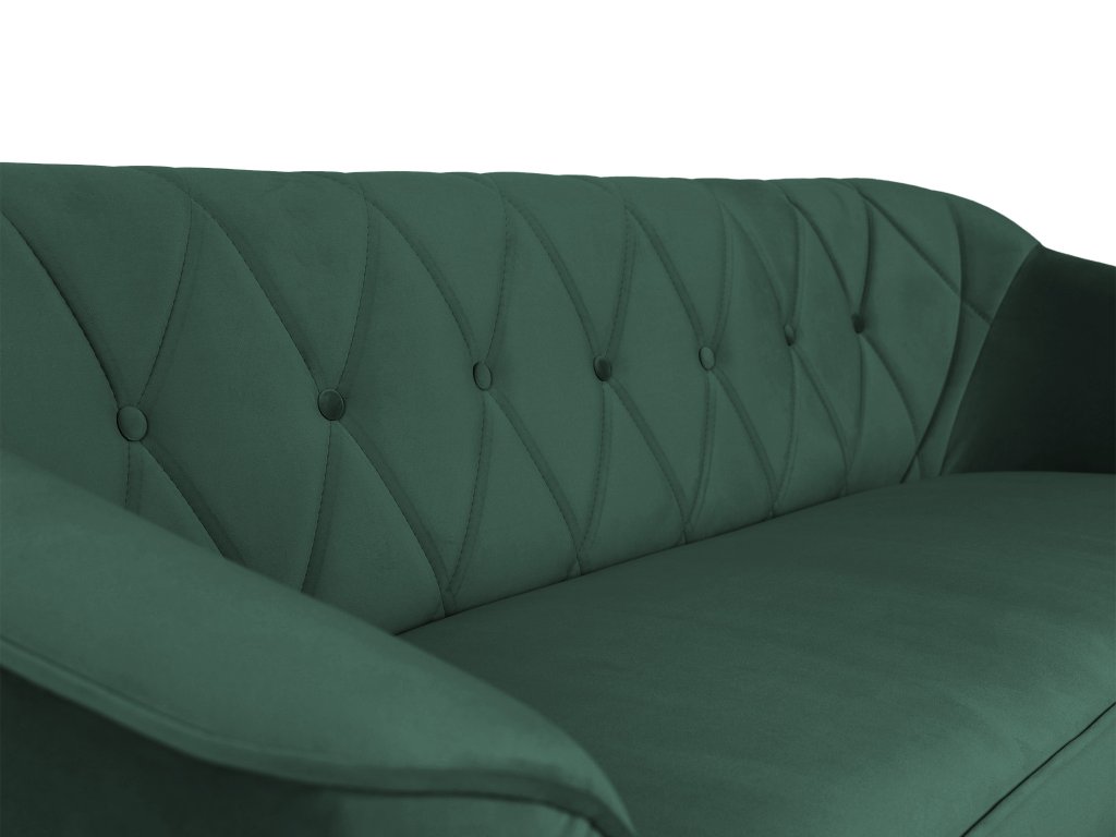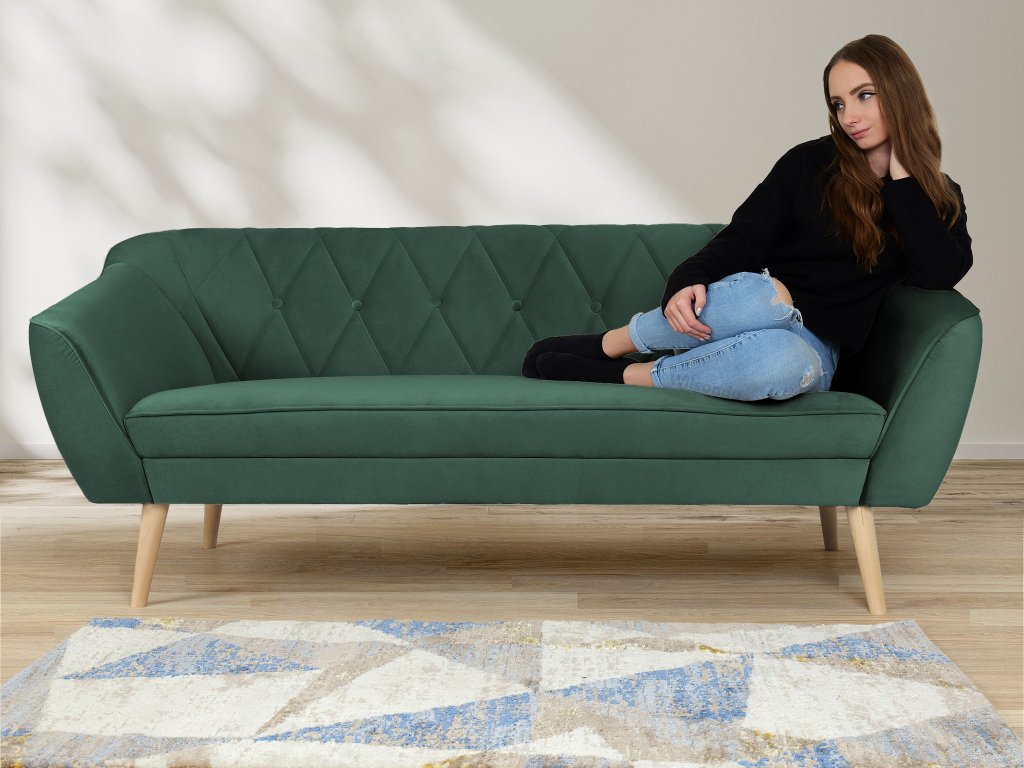 Už len pri pohľade na túto pohovku a jej priam magickú farbu sa začnete cítiť uvoľnene a komfortne. Pravý relax však zažijete, keď si na ňu sadnete, alebo sa rovno natiahnete k obľúbenému šlofíku po poobedňajšej káve. Príjemná smaragdová farba v kombinácii s prípadnou dekou alebo pohodlným vankúšom vám pomôže okamžite zaspať alebo prečistiť si hlavu (je vedecky dokázané, že pohľad na zelenú človeka upokojuje). Pohovku máme v našej ponuke aj v kratšej dvojmiestnej verzií, no z rovnakého modelového radu si môžete objednať aj jednoduché kreslo, televízny ušiak alebo taburet pre vyloženie nôh po náročnom dni.