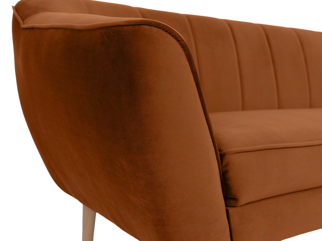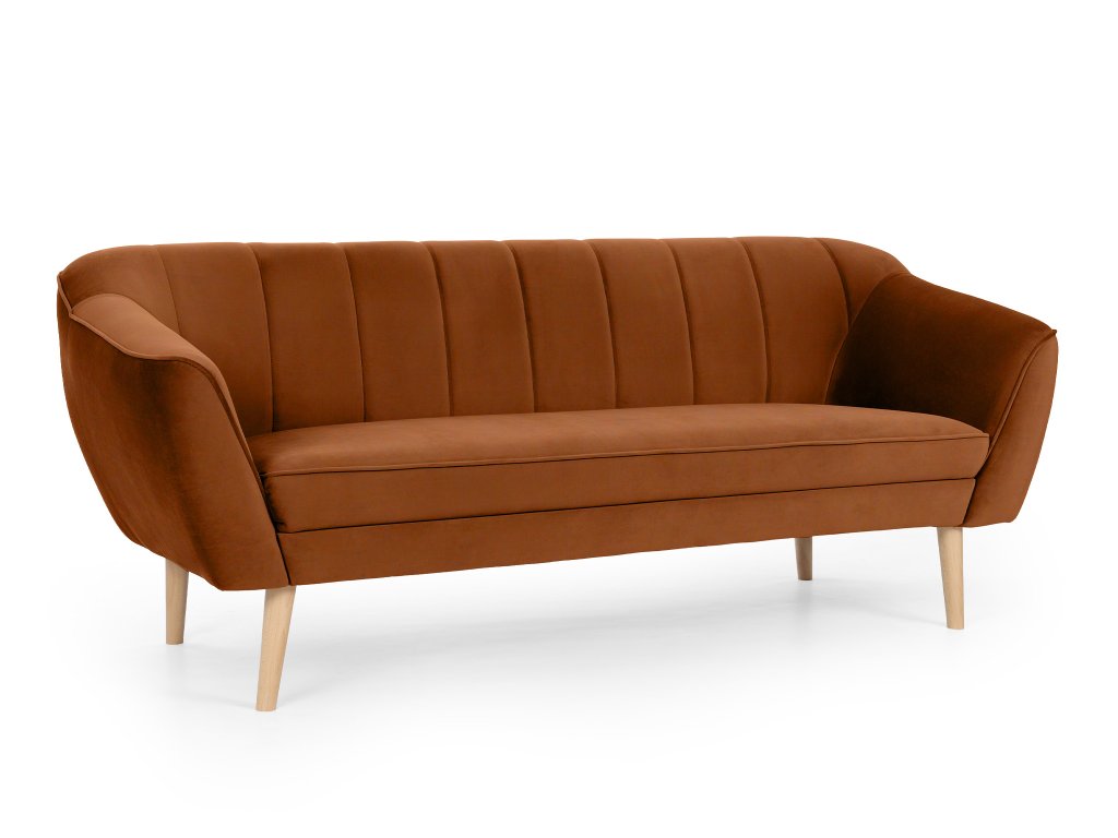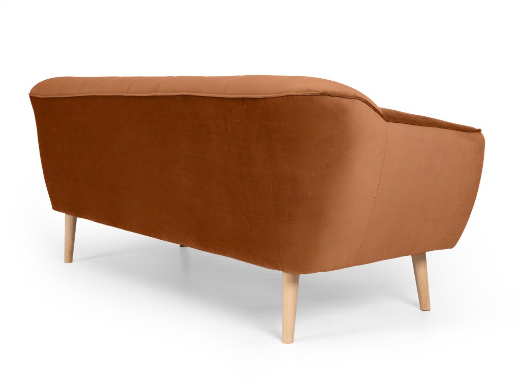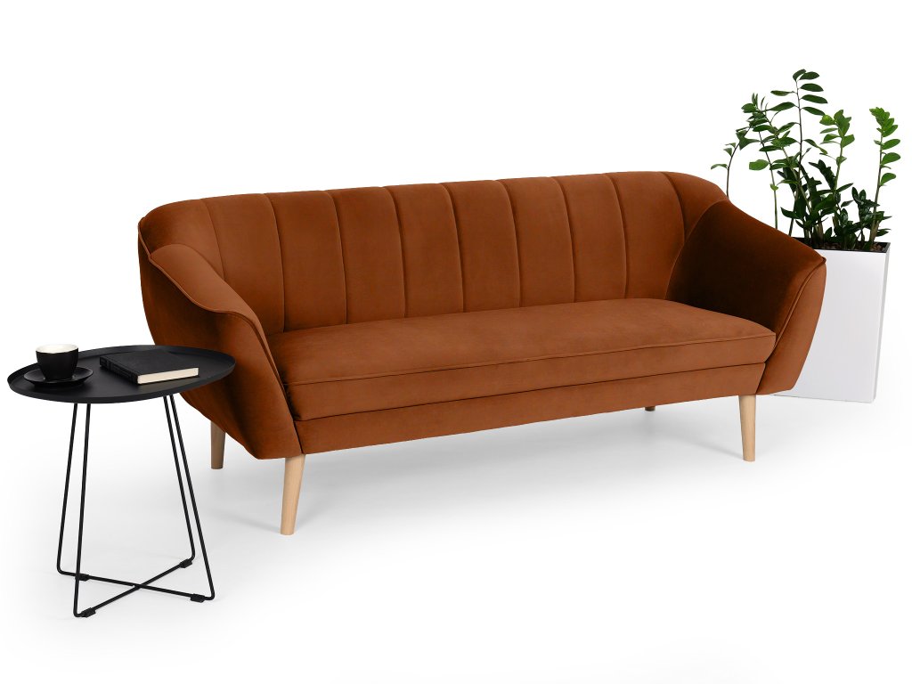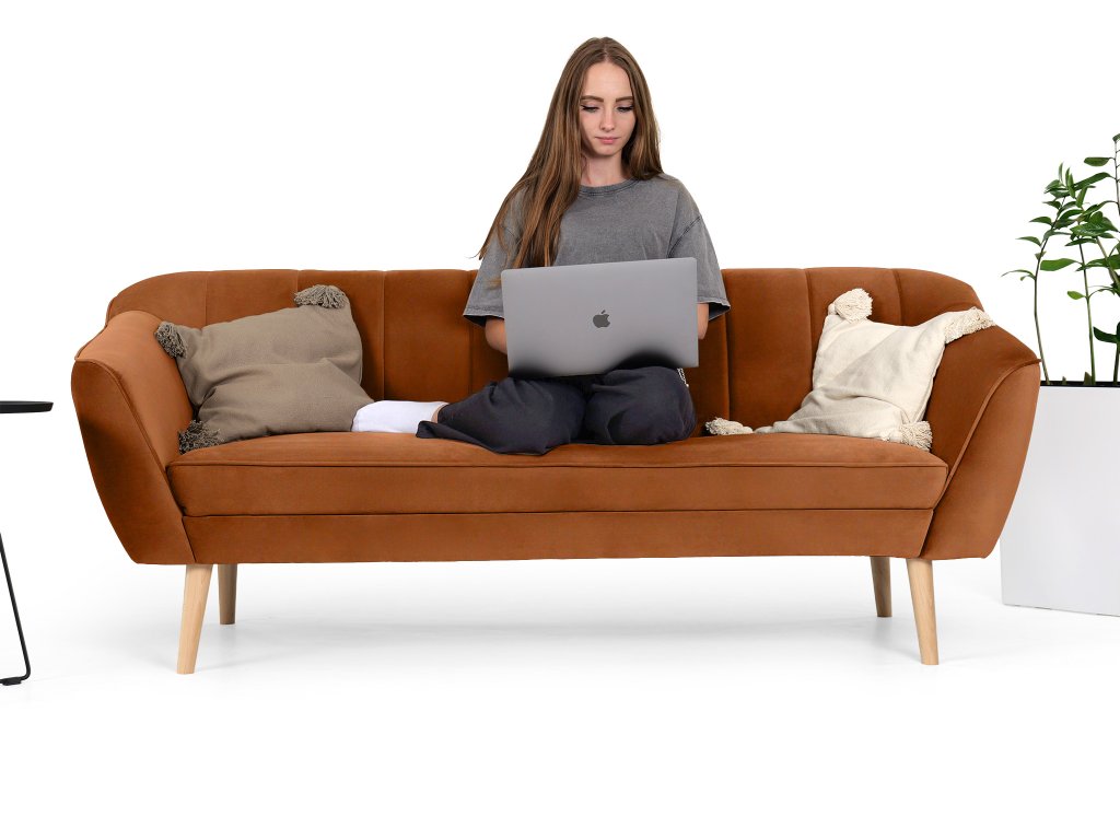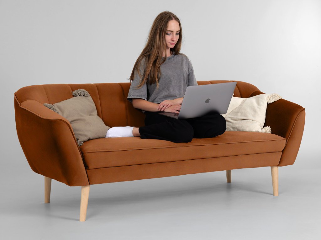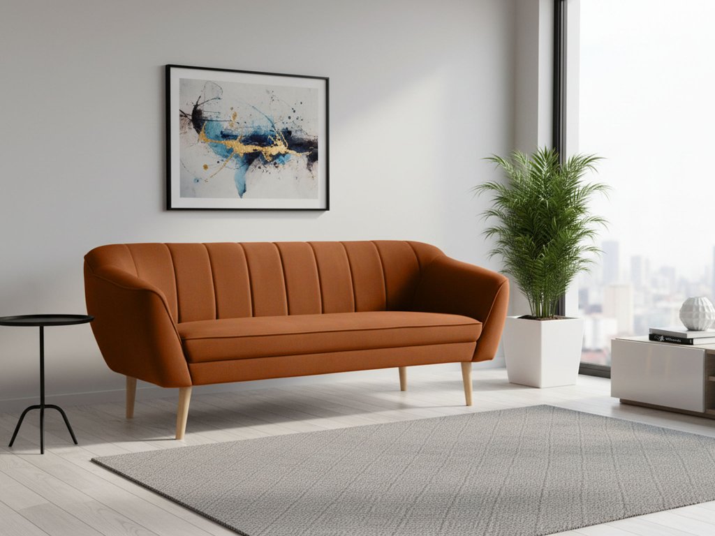 Trojmiestna konštrukcia poskytuje dostatok priestoru pre rodinu aj návštevy. Sedadlo tvorí pevná pena s vyššou hustotou, ktorá udrží tvar a zabezpečí dlhodobý komfort. Mäkkšie operadlo ponúka oporu chrbta pri relaxe, čítaní alebo sledovaní filmu. Drevené nožičky dodávajú pohovke stabilitu. Tehlová farba pôsobí útulne a moderne zároveň, vďaka čomu sa čalúnená pohovka skvele kombinuje s neutrálnymi i odvážnejšími doplnkami.