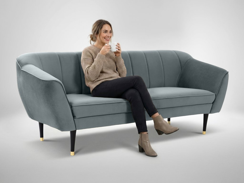 Tmavosivá farba pohovky pôsobí decentne a univerzálne, čo umožňuje jednoduché kombinovanie s ostatným nábytkom. Vertikálne prešívanie operadla dodáva pohovke štruktúru, zatiaľ čo čierne nožičky so zlatým okrajom vytvárajú kontrastný detail. Vďaka svojmu tvaru sa hodí tak do minimalistických, ako aj do originálnejších interiérov.