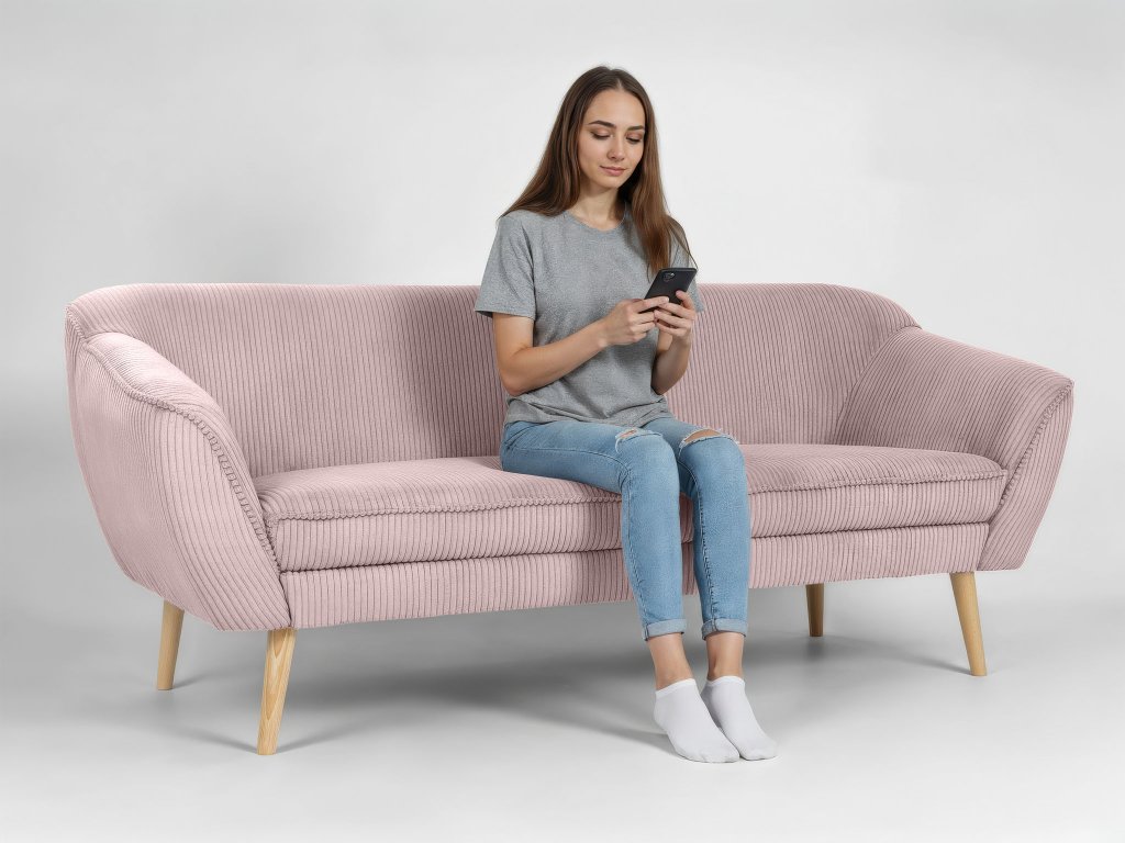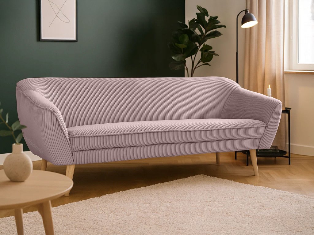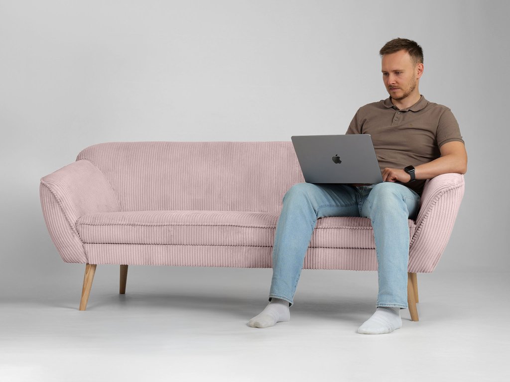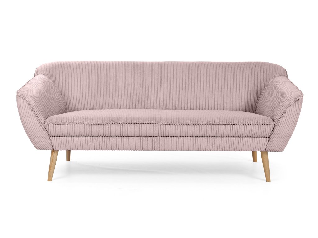 Čalúnená pohovka Dory ponúka pohodlné sedenie až pre troch ľudí a zároveň pôsobí ako dizajnový prvok, ktorý oživí každý moderný interiér. Svetloružový čalúnený poťah so zaujímavou textúrou sa ľahko skombinuje s ostatným zariadením miestnosti. Sedacia časť je mäkká vďaka použitej pene typu T30. Operadlo je vyplnené o niečo tuhšou penou T25, čo zabezpečuje oporu aj pri dlhšom sedení. Látka Lincoln, z ktorej je pohovka čalúnená, vyniká svojou odolnosťou a jemným pruhovaným vzorom. Drevené nohy v svetlom odtieni dreva dodávajú pohovke celkovú stabilitu.