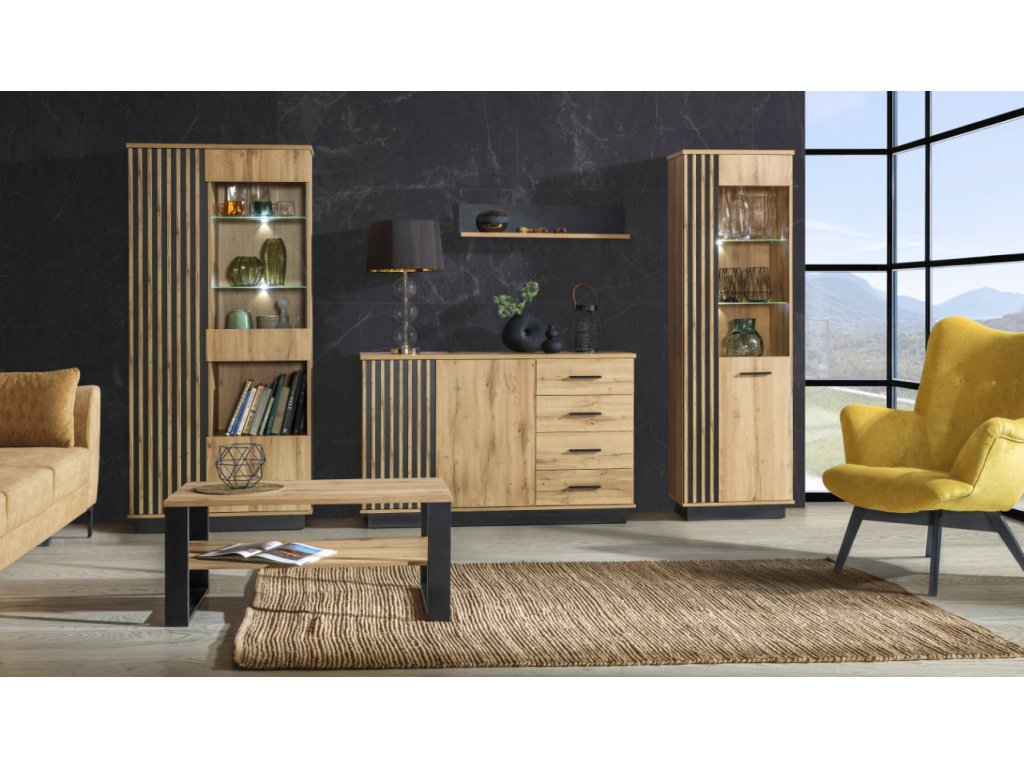 Nábytok z kolekcie LAMELO je nadčasový kúsok, ktorý zvýrazní každú časť interiéru. Nábytok dokonale splní svoju funkciu v obývačke, kancelárii alebo v jedálni. Kolekcia Lamelo pozostáva z farebnej kombinácie dub wotan/čierna, ktorá prináša do každého domova neobyčajné prvky luxusu. Hrany sú upravené kvalitnou PVC dyhou, ktorá ochraňuje nábytok pred opotrebením. Nábytok disponuje bezúchytovým systémom v jednej časti, ktorý je doplnení o plastové úchyty v čiernej farbe.