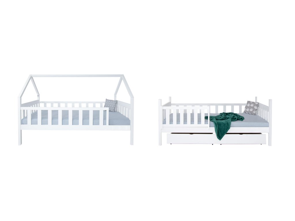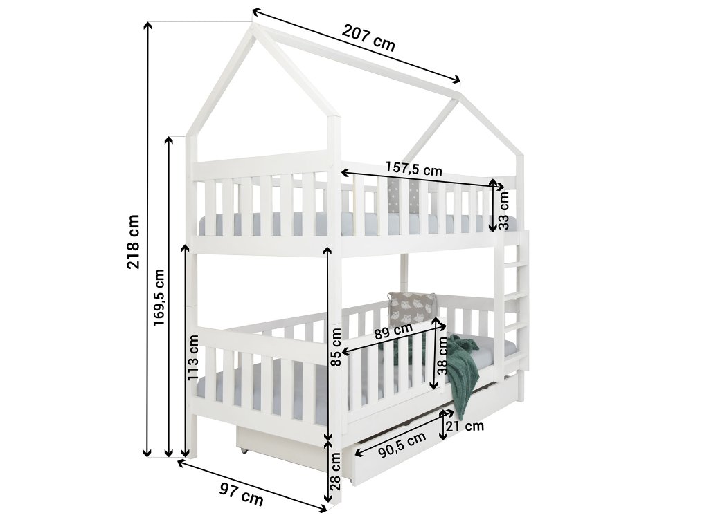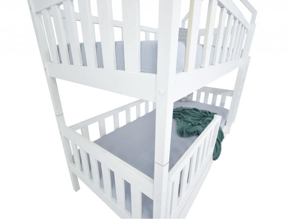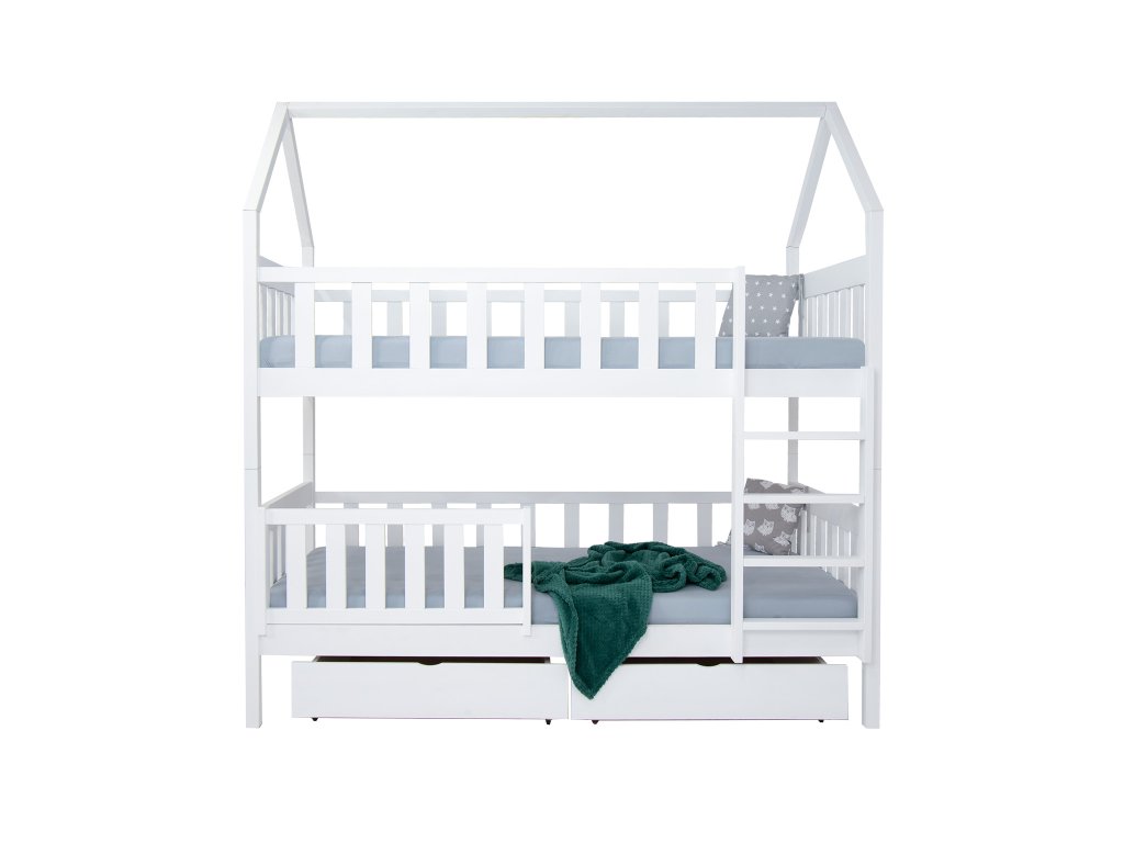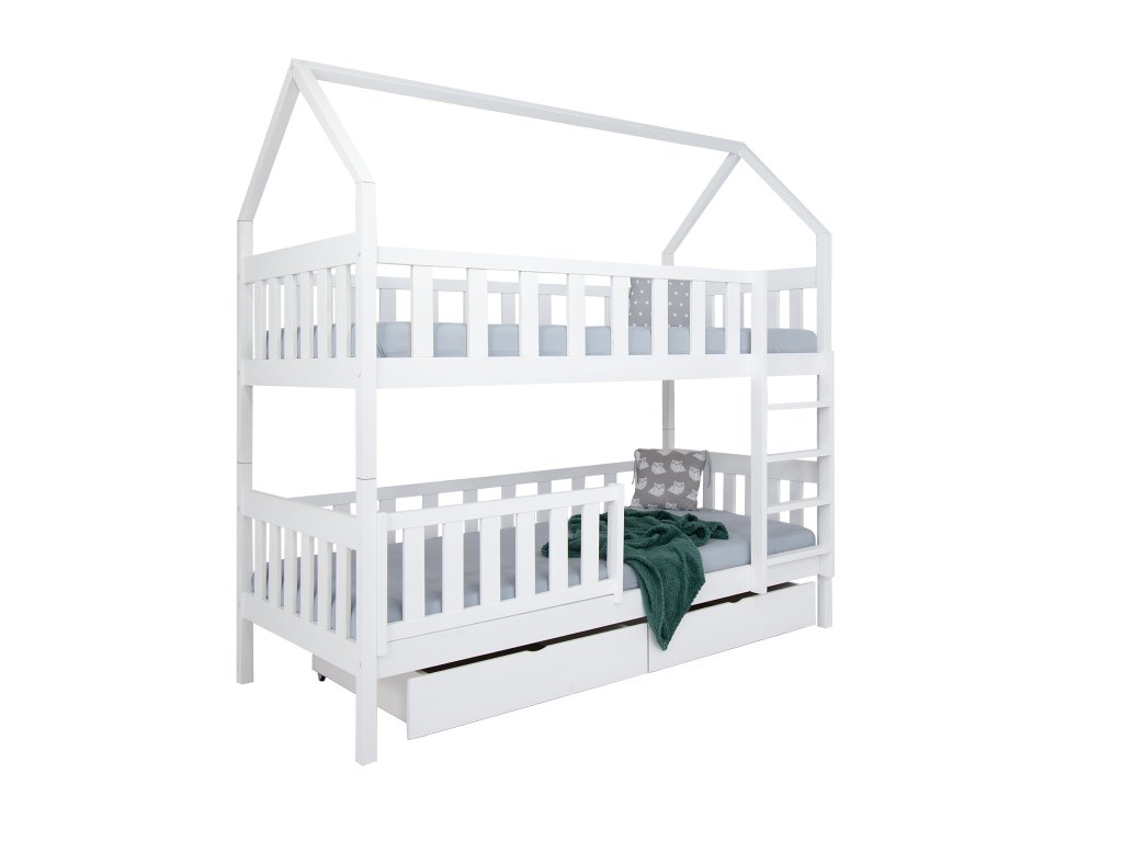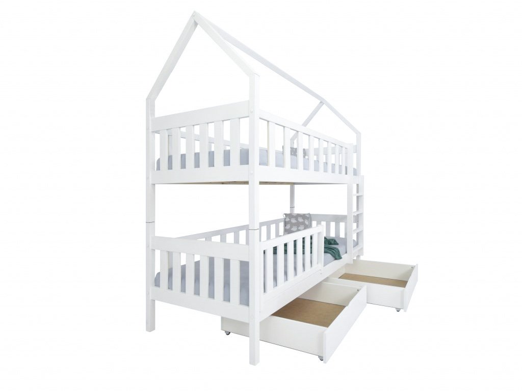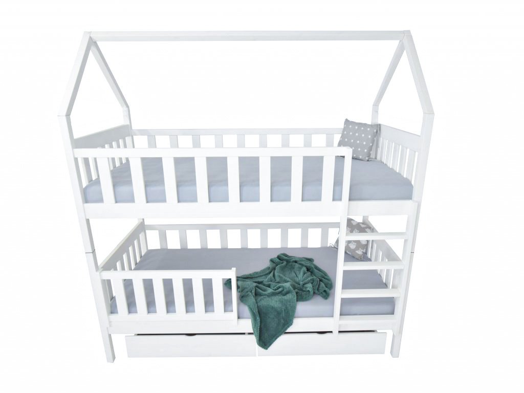 Kvalitná biela poschodová posteľ (200x90 cm) v tvare domčeka je vyrobená z masívu borovice a má pevnú konštrukciu. Posteľ je dostupná v neutrálnej bielej farbe, 3x lakovaná ekologickým lakom. Rebrík je obojstranný, tzn. posteľ je možné namontovať s rebríkom na pravej aj ľavej strane. Rošty sú tiež vyrobené z pevného dreveného masívu. Súčasťou postele sú 2 úložné priestory, ktoré sú na umelých kolieskach, aby Vám nepoškodili podlahu. Nie sú upevnené, čiže je s nimi veľmi ľahká manipulácia. Na spodnom lôžku je bariérka, ktorá je súčasťou postele a chráni dieťatko pred vypadnutím z postele. Posteľ je možné rozložiť na dve samostatné lôžka.