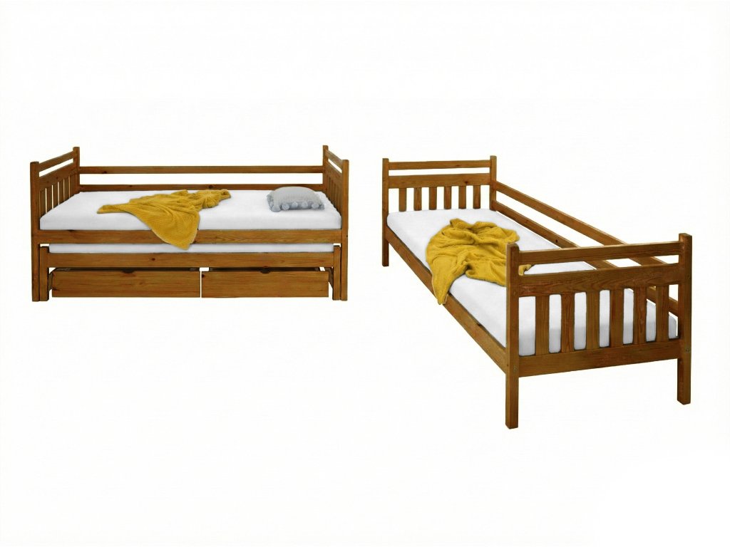 Poschodové postele dokážu výrazne ušetriť miesto v byte alebo dome, no ak chcete vyriešiť spánok pre tri dospelé osoby doslova na dvoch metroch štvorcových a zároveň na tomto priestore ešte získať aj nejaký ten úložný priestor, táto posteľ je tou najlepšou možnou voľbou. Okrem tmavšej dubovej farby máme v ponuke aj variant v bielej farbe alebo v prírodnom borovicovom vyhotovení, aby posteľ dokonale zapadlo do celkového konceptu konkrétnej izby. Pri vôni borovicového dreva sa vám bude sladko zaspávať a čo je najdôležitejšie, každý si môže do postele vybrať matrac podľa svojich preferencií.