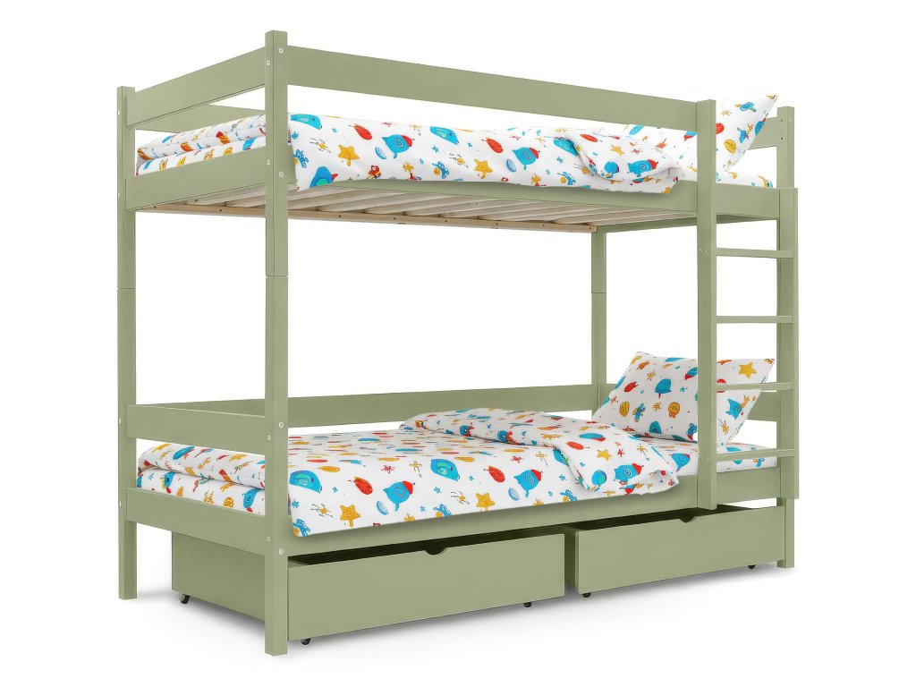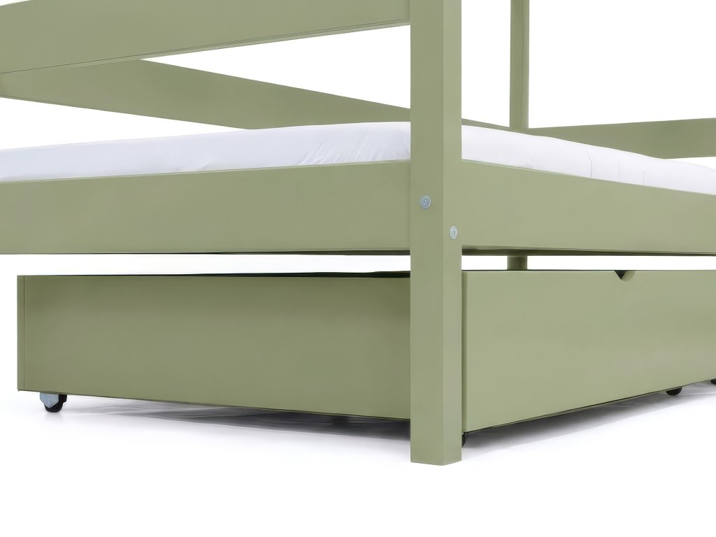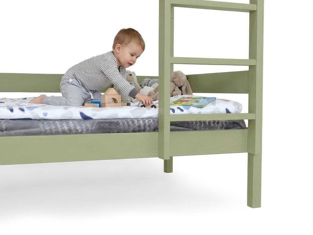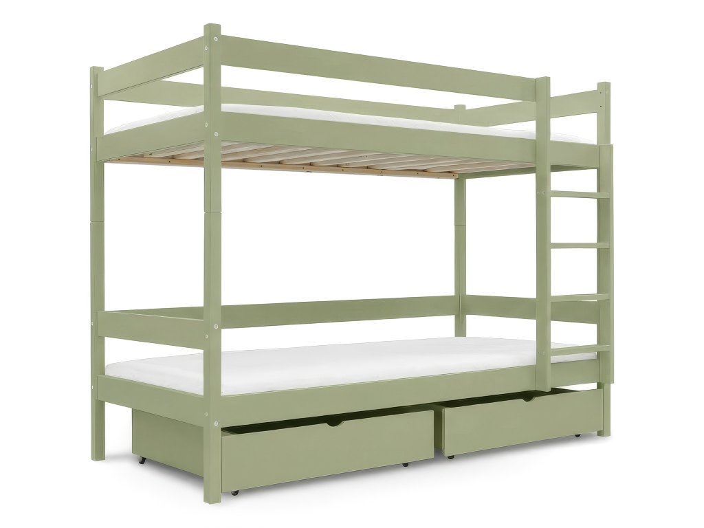 Detská poschodová posteľ 90 × 200 Paula 2 v olivovej farbe prinesie do izby príjemnú atmosféru a moderný charakter. Odtieň olivy krásne zvýrazňuje kresbu masívnej borovice, z ktorej je posteľ vyrobená. Masív poskytuje pevné a stabilné prevedenie, takže posteľ spoľahlivo poslúži deťom aj študentom. Celú konštrukciu je možné jednoducho rozdeliť na dve samostatné postele – stačí uvoľniť kolíkové spojenie, ktoré umožňuje rýchlu a intuitívnu manipuláciu. Rebrík môžete pripevniť z pravej aj ľavej strany, čo pomáha lepšie prispôsobiť posteľ aktuálnemu rozloženiu izby.