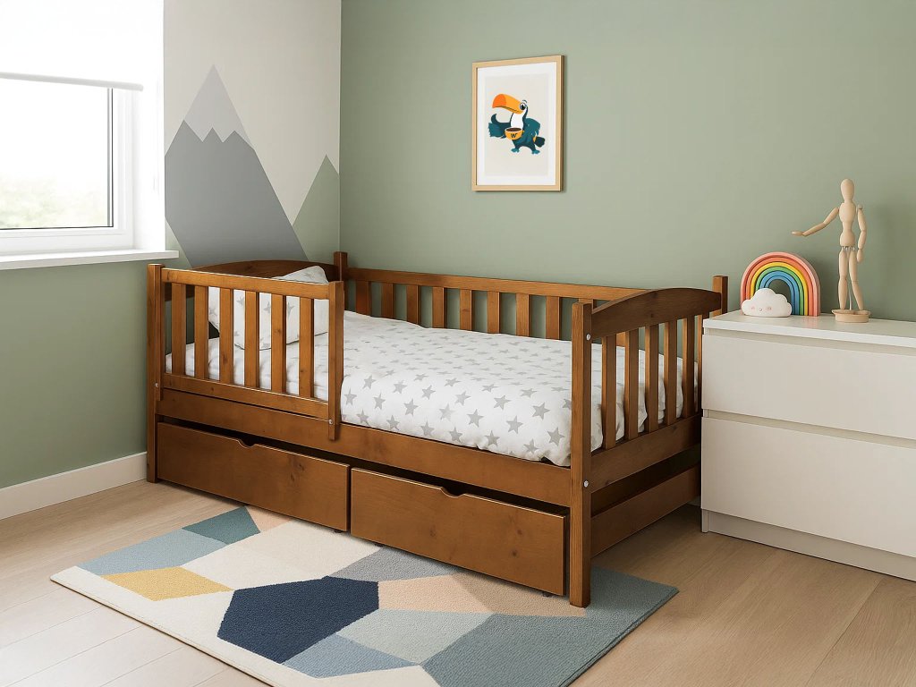 Drevená posteľ Oľga 2 je vyrobená z kvalitného masívu borovovice. Posteľ je dostupná vo farbe dubu a ošetrená bezfarebným ekologickým lakom. Vďaka použitým materiálom je posteľ vysoko kvalitná a stabilná. Posteľ je dodávaná spolu s roštom a úložnými priestormi. Manipulácia s úložnými boxmi je veľmi jednoduchá, pretože nie sú nijak upevnené k posteli. Posteľ má bezpečnostnú bariéru, ktorá chráni dieťatko pred pádom z postele. Bariéru je možné namontovať na obe strany postele. Bariérka je odnímateľná, keď dieťatko vyrastie stačí ju jednoducho odmontovať. Odtieň postele sa od fotografie môže mierne líšiť!