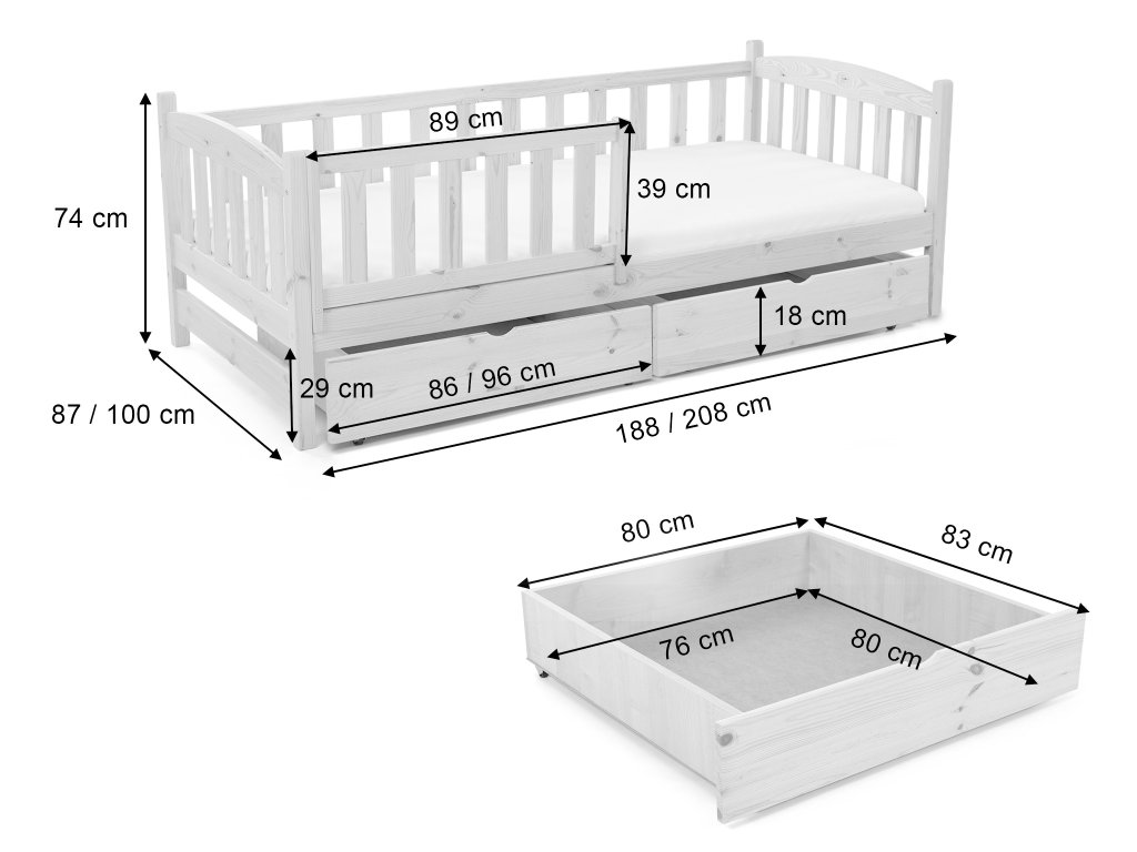 Ak sa vám prírodná borovicová farba nehodí do konceptu vysnívanej detskej izby, túto detskú posteľ máme v ponuke aj variant v bielej farbe alebo vo farbe dubu. Posteľ máme navyše skladom v dvoch veľkostných typoch, a to s rozmerom lôžka 180x80 cm a 200x90 cm. S odnímateľnou bariérkou a nosnosťou až 100 kg poslúži táto posteľ vašim deťom až do dospelosti. Kompaktnejší model vám zase pomôže ušetriť viac priestoru v detskej izbe s menšou podlahovou plochou, vďaka čomu vám zostane miesto aj na ďalší detský nábytok.