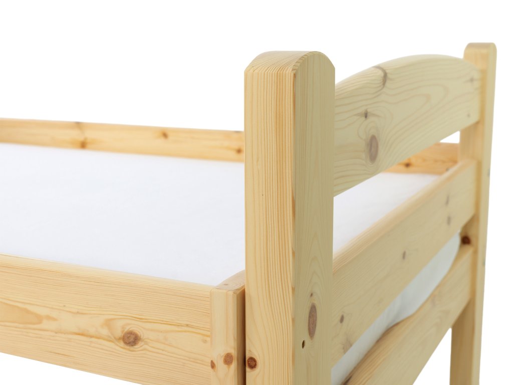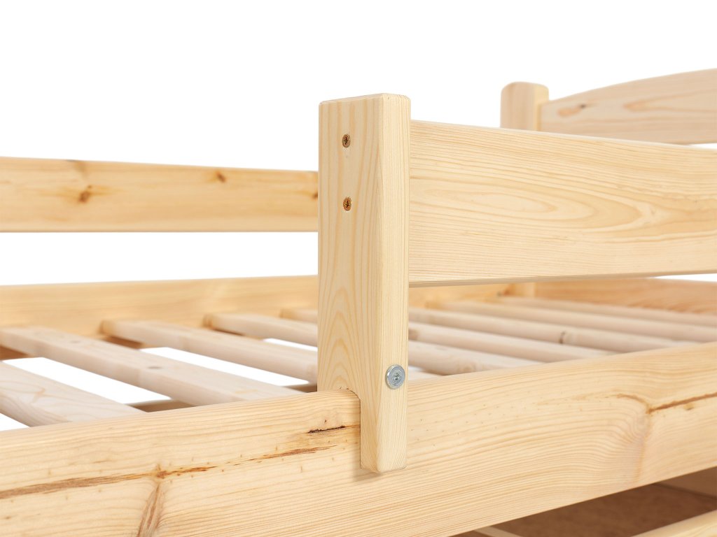 Posteľ Oľga 5 200x90 cm je vyrobená z kvalitného masívu borovovice. Výrobok je dostupný v prírodnej farbe a ošetrený bezfarebným ekologickým lakom. Vďaka použitým materiálom je posteľ vysoko kvalitná a stabilná. Posteľ je dodávaná spolu s roštom a úložnými priestormi. Manipulácia s úložnými boxmi je veľmi jednoduchá, pretože nie sú upevnené k posteli. Posteľ má bezpečnostnú bariéru, ktorá chráni dieťatko pred pádom z postele. Je možné ju namontovať na obe strany postele. Bariérka je odnímateľná, keď dieťatko vyrastie stačí ju jednoducho odmontovať.