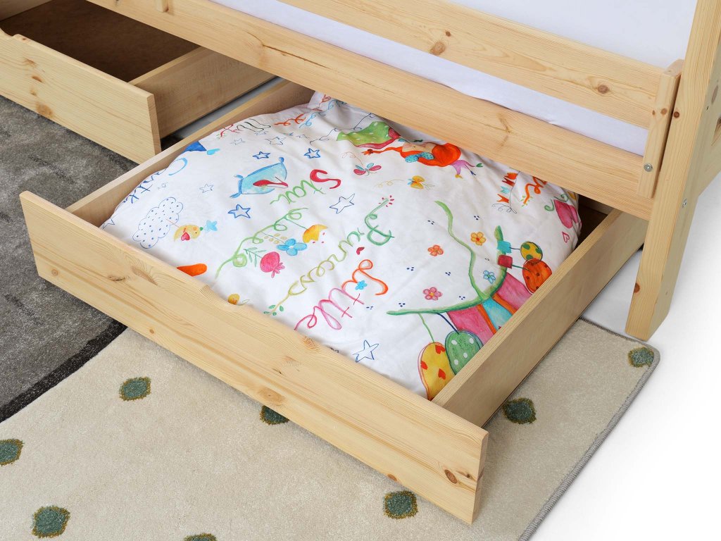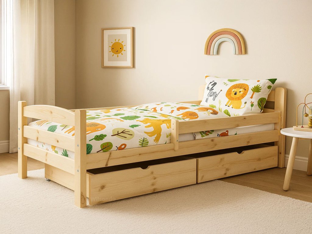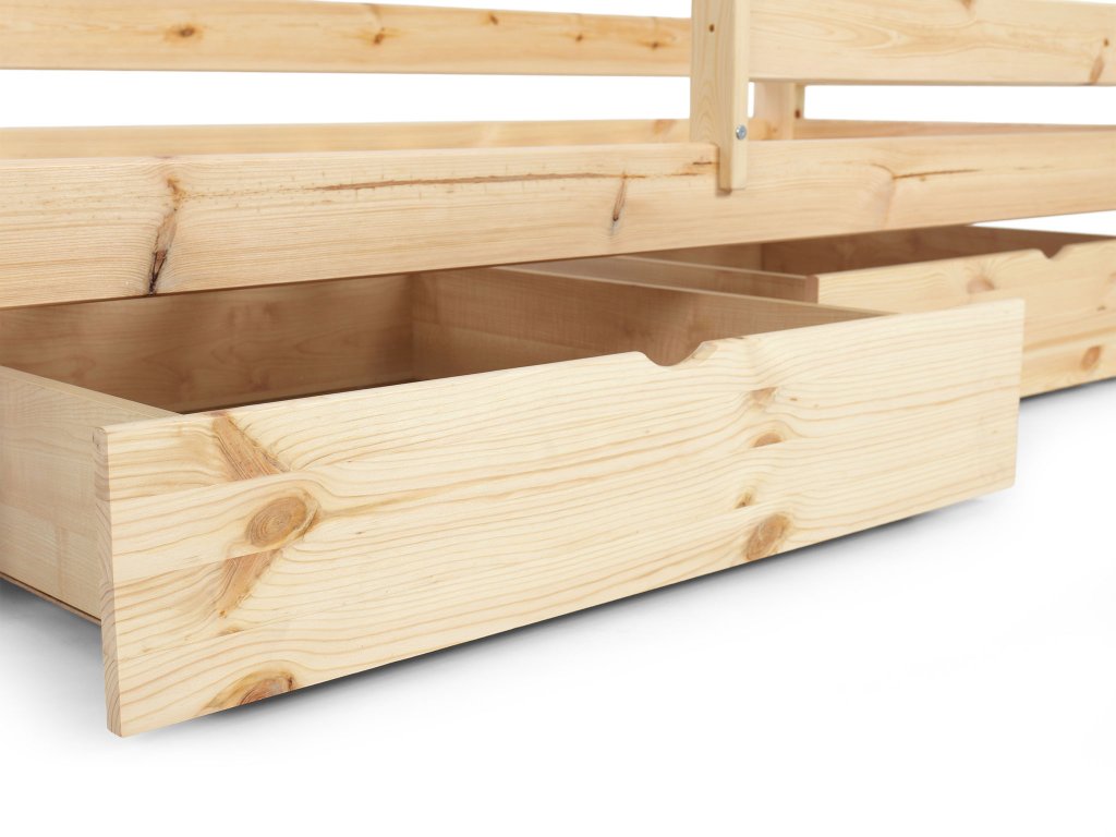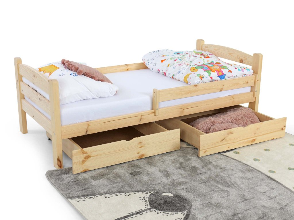 Borovicová detská posteľ so zábranou a úložným priestorom