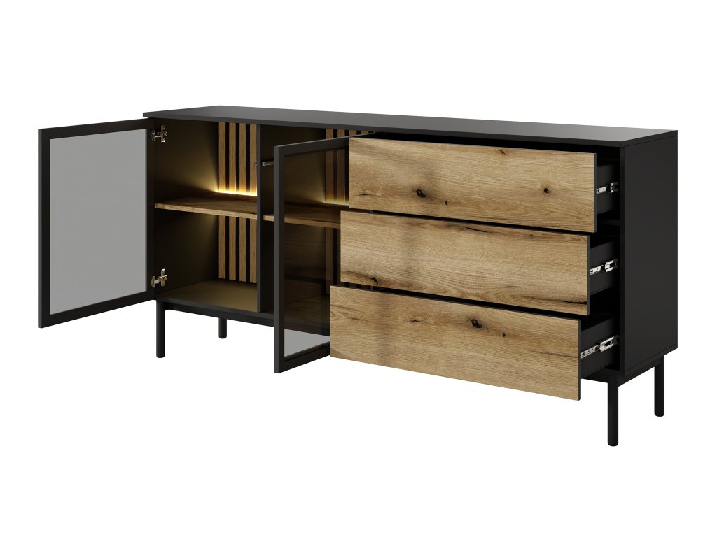Široká presklená komoda Lango ponúka veľkorysý priestor na vystavenie aj uskladnenie vašich vecí. Presklená časť s jemným LED osvetlením elegantne zvýrazní dekorácie, obľúbený riad či dizajnové kúsky, zatiaľ čo uzavreté úložné priestory poskytnú praktické miesto na všetko, čo chcete mať prehľadne upratané. Vďaka svojmu rozmernému prevedeniu je ideálna ako výrazný prvok obývačky, jedálne alebo reprezentatívneho priestoru v dome či kancelárii.