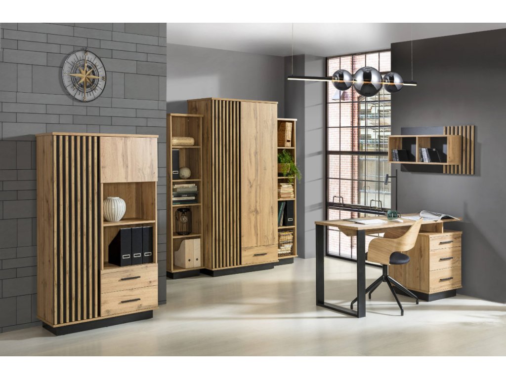 Nábytok z kolekcie LAMELO je nadčasový kúsok, ktorý zvýrazní každú časť interiéru. Nábytok dokonale splní svoju funkciu v obývačke, kancelárii alebo v jedálni. Kolekcia Lamelo pozostáva z farebnej kombinácie dub wotan/čierna, ktorá prináša do každého domova neobyčajné prvky luxusu. Hrany sú upravené kvalitnou PVC dyhou, ktorá ochraňuje nábytok pred opotrebením. Nábytok disponuje bezúchytovým systémom v jednej časti, ktorý je doplnení o plastové úchyty v čiernej farbe.