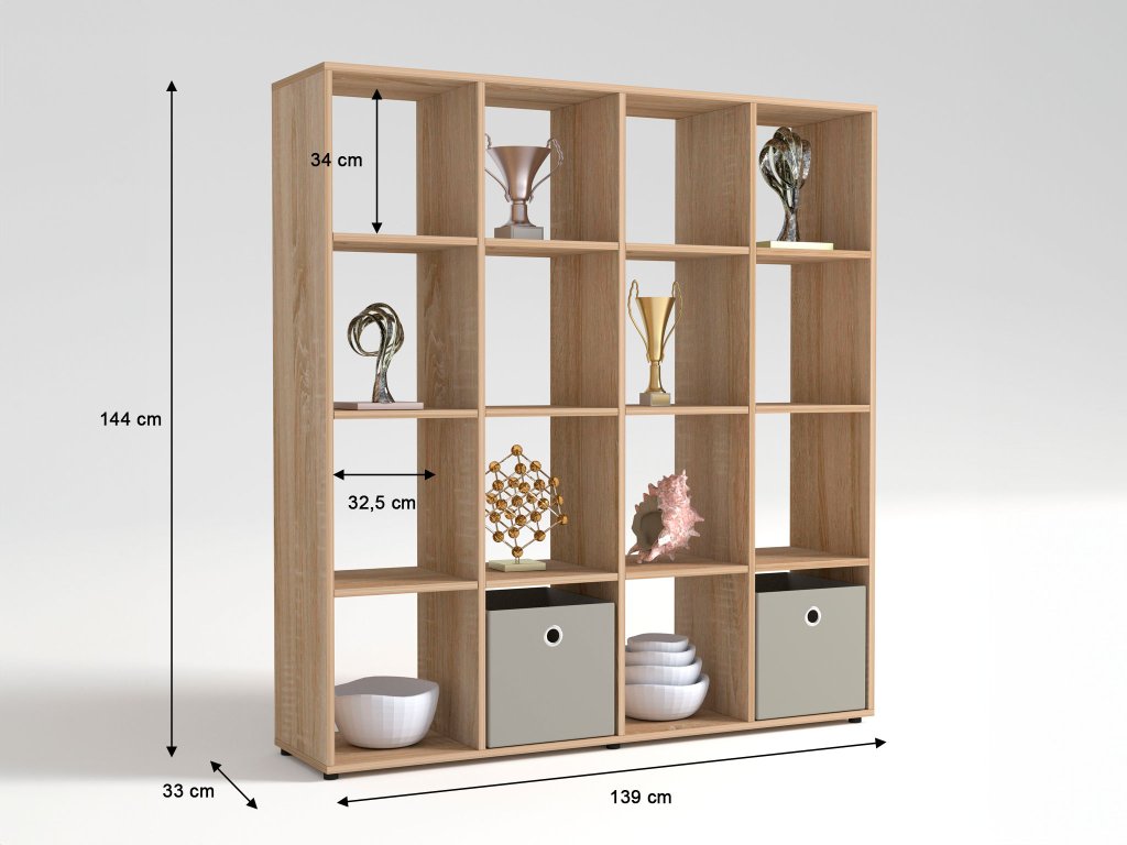 Policový regál Luini je moderný a elegantný nábytok vyrobený z vysokokvalitnej 16 mm laminovanej dosky, čo zabezpečuje odolnosť a dlhú životnosť. Jeho prírodná farba dub Sonoma pridá do vášho priestoru teplý a prirodzený pocit. S až šestnástimi štvorcovými policami ponúka dostatok úložného priestoru pre rôzne predmety, či už sú to knihy, dekorácie, kvety alebo iné drobnosti. Tento regál nie je len praktický, ale aj všestranný. Je ideálny do obývačky, detskej izby, pracovne či kancelárie a vytvára organizovaný, uprataný a štýlový priestor. Osem nožičiek zospodu pridáva nábytku stabilitu. Luini je navrhnutý tak, aby vyhovoval rôznym estetickým preferenciám a mohol slúžiť ako skvelý doplnok do rôznych interiérov. S regálom Luini pridáte do svojho domova nielen praktický úložný priestor, ale aj štýlový a moderný prvok.