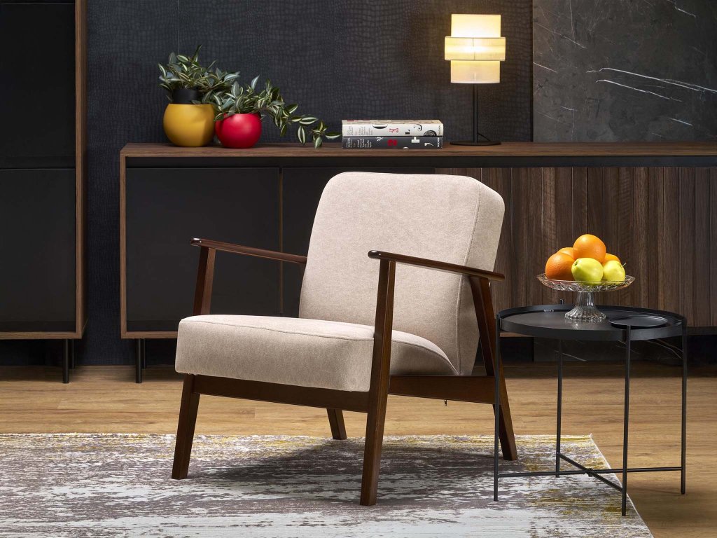 Retro kreslo Klokov je skvelým spoločníkom, vhodným na relaxáciu a oddych. Relaxačné kreslo do obývačky, do predsiene, do kancelárie a iných miestností je vyrobené z kvalitnej čalúnenej látky Castel v dokonalej béžovej farbe, ktorá zvýrazňuje jeho moderný vintage štýl. Navyše je táto látka veľmi luxusná a nadčasová. Konštrukcia je tvorená z masívneho bukového dreva. Tým je vhodné na pohodlné a stabilné sedenie počas vášho oddychu. Spomínané materiály sú nielen estetické, ale aj udržiavateľné a ľahko sa čistia. Toto béžové kreslo je zárukou kvalitného nábytku a pohodlia vašej domácnosti. Je ideálne na čítanie, popíjanie kávy alebo na vychutnanie oddychu po namáhavom dni. Vytvorte si svoje retro miesto s našimi produktami a užite si nezabudnuteľné chvíle spojené s modernou históriou.
