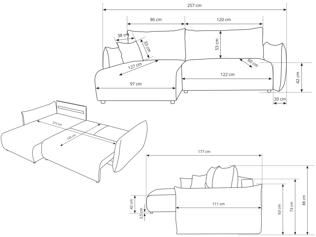 - Rozmer lôžka po rozložení: 212 x 145 cm