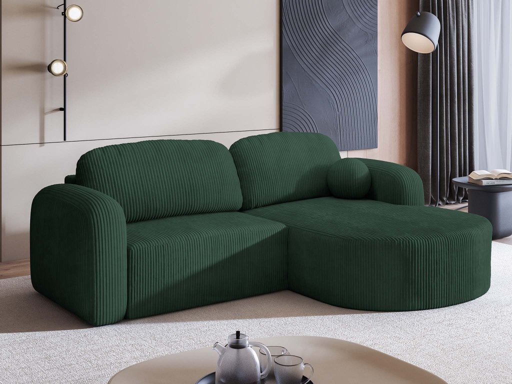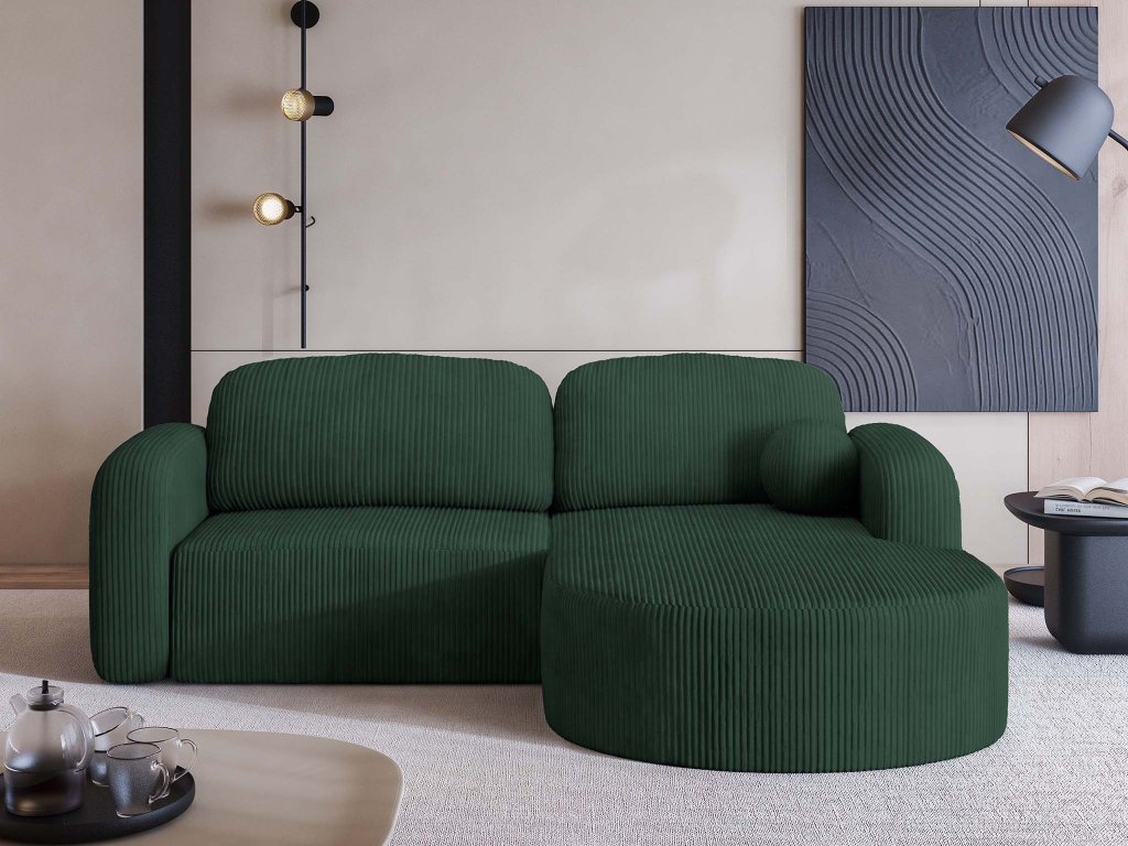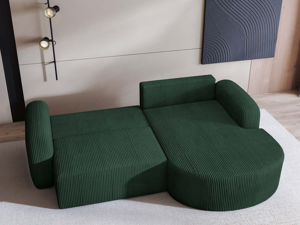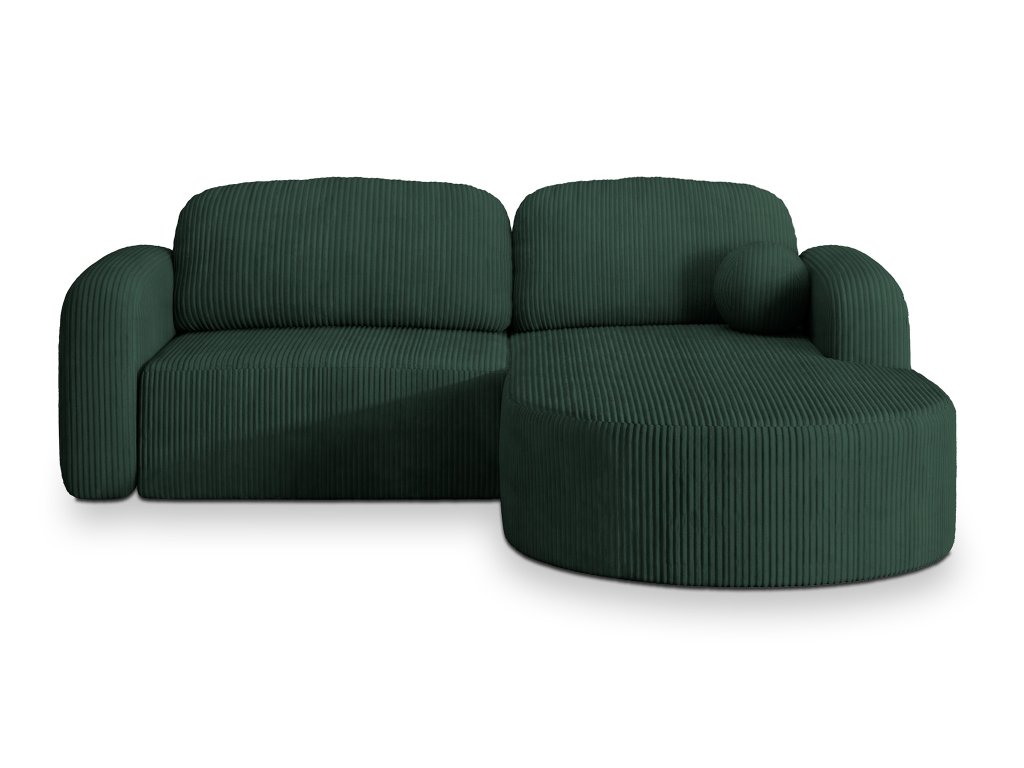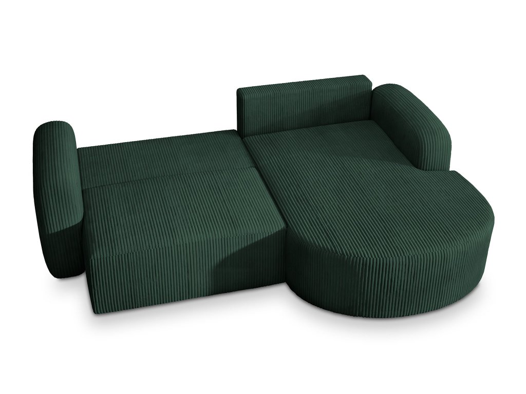 Rohová rozkladateľná pohovka Amilia v elegantnej tmavozelenej farbe okamžite upúta pozornosť a vnesie do Vášho domova pocit luxusu a prírody. Vizuálne najpríťažlivejším prvkom je zaoblený taburet( predĺžená časť, ktorý narúša ostré línie a dodáva pohovke moderný šarm. Pohovka je čalúnená obľúbenou menčestrovou látkou Poso, ktorej hrubé pruhy zvýrazňujú hĺbku tmavozeleného odtieňa a sú príjemné na dotyk. Látka Poso je známa svojou vysokou odolnosťou, stálofarebnosťou voči slnečnému žiareniu a priedušnosťou, ktorá zaisťuje príjemné sedenie aj počas dlhých hodín. Sedenie je mimoriadne pohodlné vďaka kombinácii vlnových pružín a peny T30, ktoré zaručujú dlhodobú elasticitu a optimálnu oporu tela.