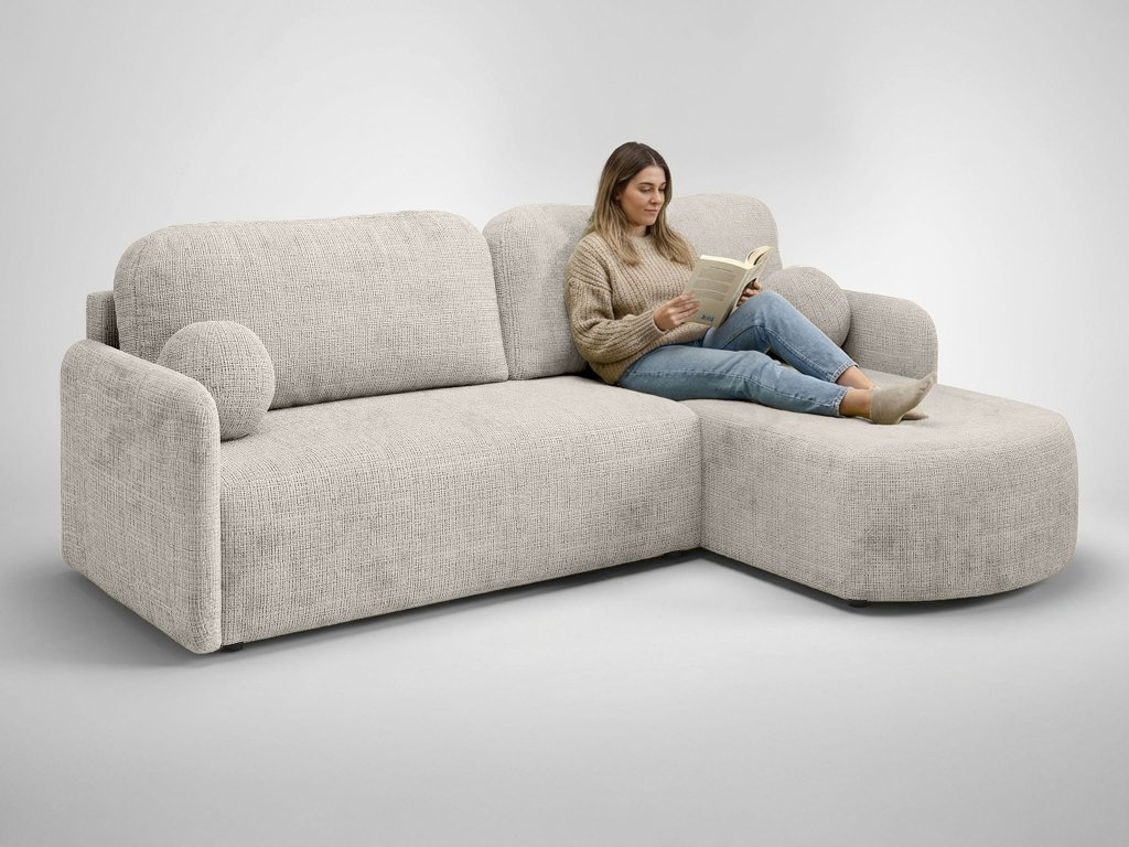 Rozkladacia sedačka Bonoa predstavuje ideálnu kombináciu pohodlia, funkčnosti a moderného dizajnu. Táto čalúnená sedačka v béžovej látke Cremona je navrhnutá tak, aby vyhovovala každodennému používaniu, či už na relax, sedenie alebo pravidelné spanie. Jej pevný rám z borovicového dreva a drevotriesky zaručuje stabilitu a dlhú životnosť, zatiaľ čo sedadlo a operadlo s vlnitými pružinami a kvalitnou penou poskytujú výnimočný komfort. Vankúše plnené granulátom sa vyznačujú vysokou elasticitou. Súčasťou sedačky sú aj dva moderné dekoračné vankúše v tvare gule a valcové operadlové vankúše, ktoré dotvárajú celkový vzhľad a zároveň poskytujú pohodlnú oporu pri sedení. Jednou z hlavných výhod tejto sedačky je rozkladacia funkcia, ktorá umožňuje rýchlo vytvoriť pohodlné lôžko. Praktický úložný priestor poslúži na odkladanie posteľnej bielizne či ďalších doplnkov, čo oceníte najmä v menších domácnostiach. Sedačka má univerzálny roh, takže si jej orientáciu môžete prispôsobiť podľa dispozície miestnosti.