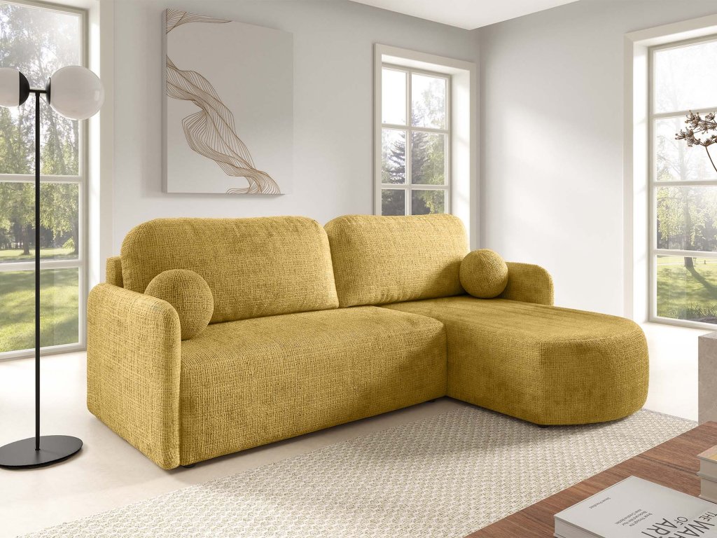 Žltá sedačka Bonoa s praktickým úložným priestorom prináša do vašej obývačky kombináciu moderného dizajnu a komfortu. Tento nábytok je navrhnutý tak, aby ste si mohli vychutnať oddych kedykoľvek, či už pri sledovaní televízie, relaxe po náročnom dni alebo pri stretnutí s rodinou a priateľmi. Stabilnú konštrukciu tvoria borovicové drevo a odolná drevotrieska, ktorá zaisťuje pevnosť a dlhú životnosť. Sedadlá dopĺňajú vlnité pružiny a hustá penová výplň, čo zabezpečuje pohodlné a ergonomické sedenie. Pohovka je navyše doplnená valcovými opierkami a dvomi dekoračnými vankúšmi, ktoré jej dodávajú štýlový charakter a podporujú komfort. Vankúše plnené granulátom sa jemne prispôsobia telu a poskytujú príjemnú pružnosť.