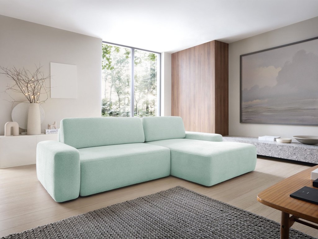 Rozkladacia rohová sedačka Bouli v modernom farebnom prevedení prinesie sviežosť do vášho bytu. Nadčasová sedačka krásnej mentolovej farby s bohatým úložným priestorom. Mohutná sedačka poskytne vám a vašej návšteve dostatok priestoru na pohodlné sedenie a relaxáciu. Rozkladacia sedačka má jednoduchý mechanizmus vďaka, ktorému dokážete sedačku jednoducho a rýchlo zmeniť na pohodlné lôžko pre hostí. Pod sedacou časťou nájdete úložný priestor, ktorý je ideálny na uskladnenie posteľného prádla a vankúšov.