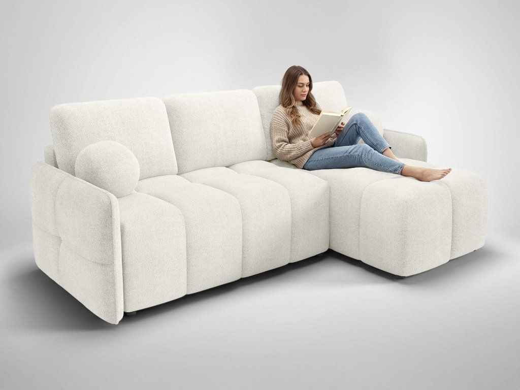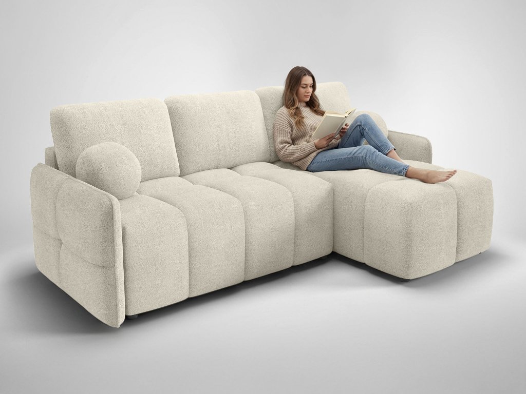 Rozkladacia rohová pohovka Moon v smotanovom prevedení prináša do obývačky jemnosť, svetlosť a moderný charakter. Jej čisté línie, precízne prešívanie a priestranné sedadlo vytvárajú harmonický celok, ktorý pôsobí vzdušne a elegantne. Pohodlné operadlá doplnené o odnímateľné vankúše umožňujú individuálne nastavenie opory pre chrbát aj krk, vďaka čomu si každý oddych užijete naplno. Čalúnená zadná časť umožňuje umiestnenie pohovky aj do stredu miestnosti a univerzálne riešenie rohu zaručuje jednoduché prispôsobenie dispozícii interiéru.